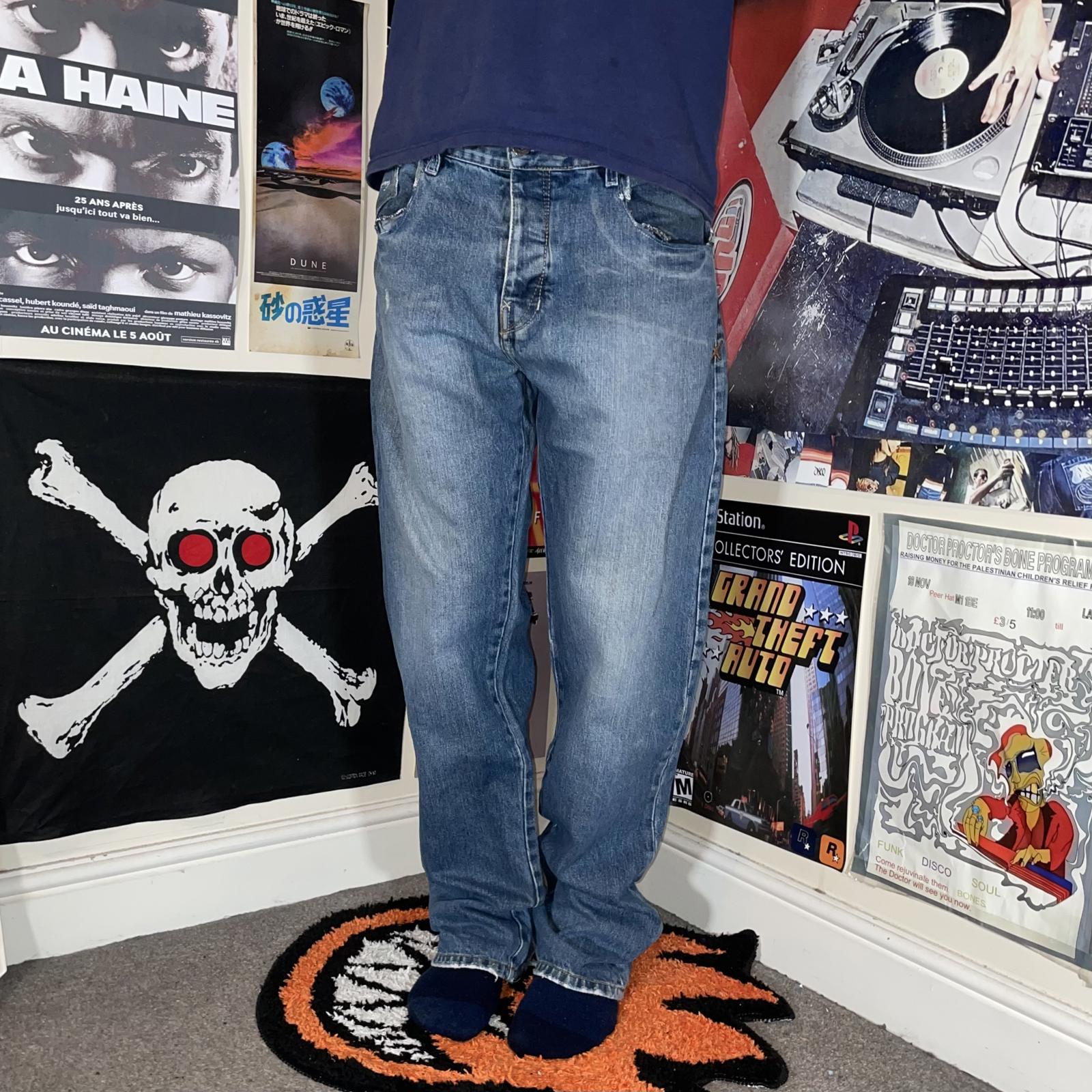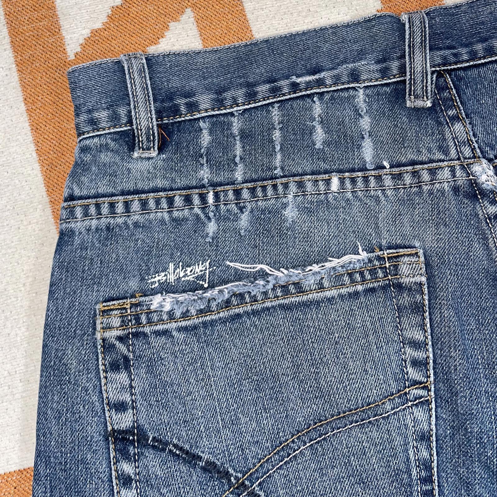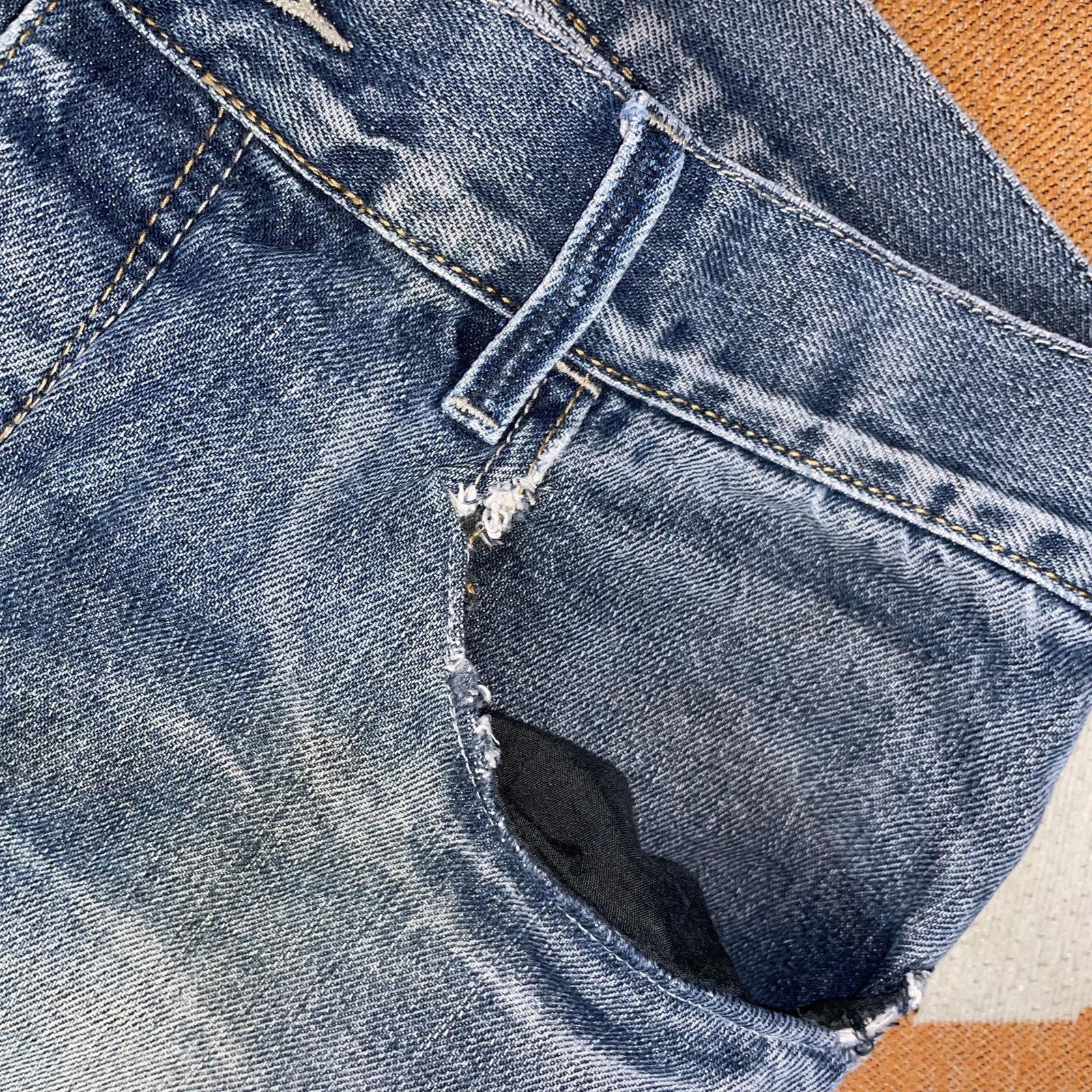 Good used condition. Distress around back + front pockets, repair at front pocket and worn cuffs.