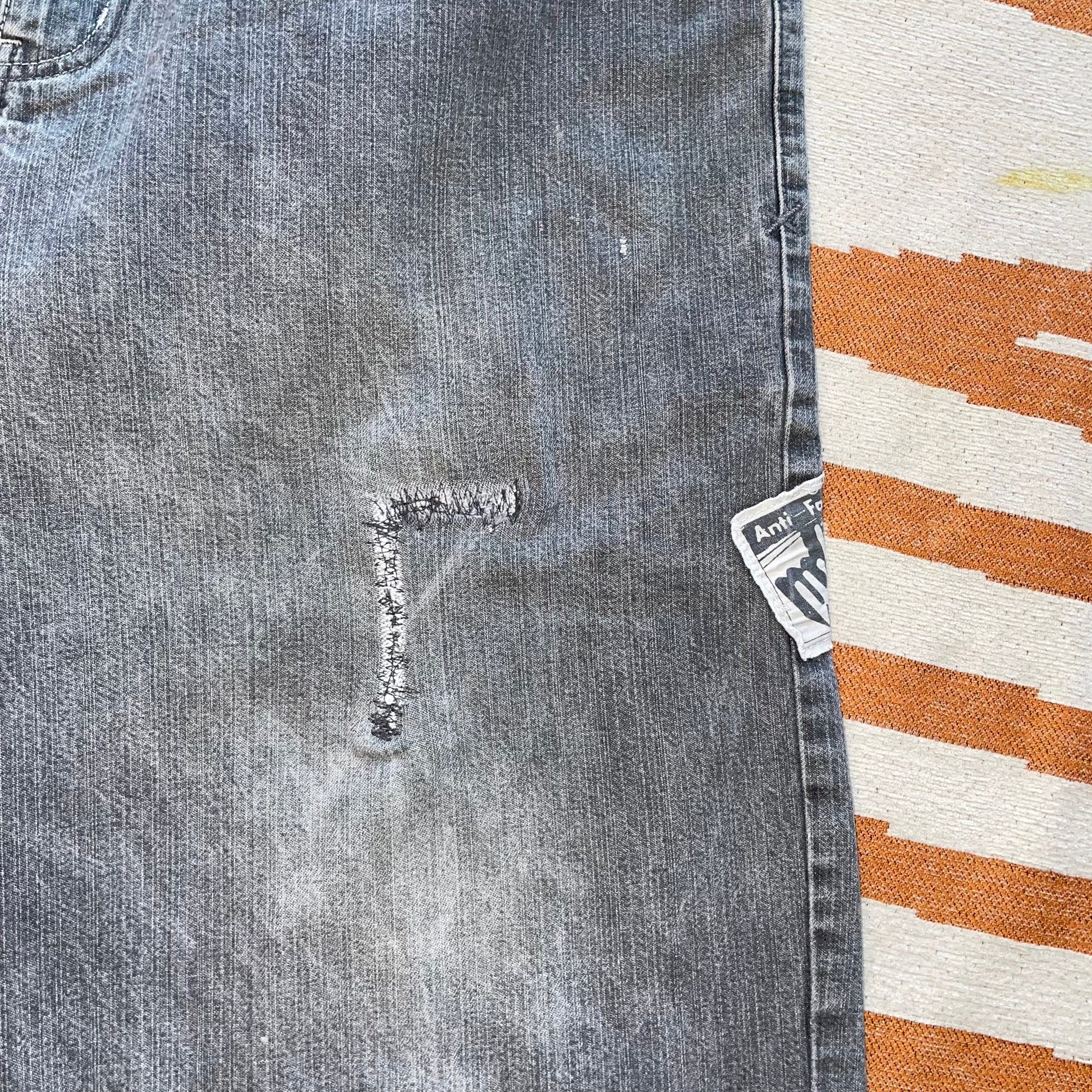 Minor damage - repair on front, light marks on back of leg, front patch stitching is partially loose.