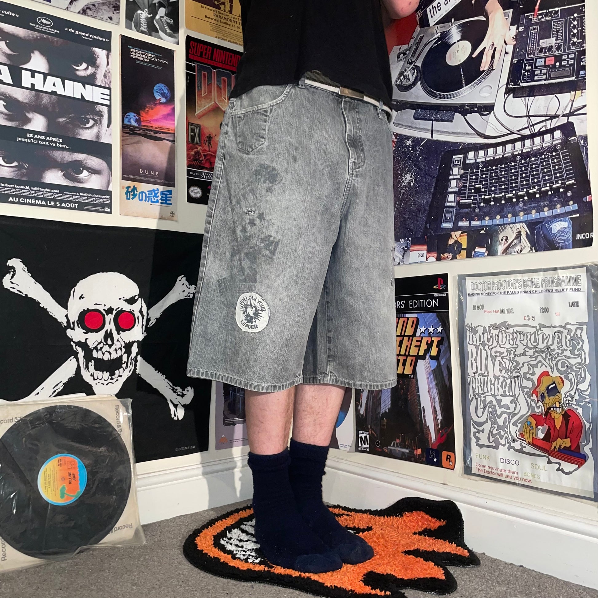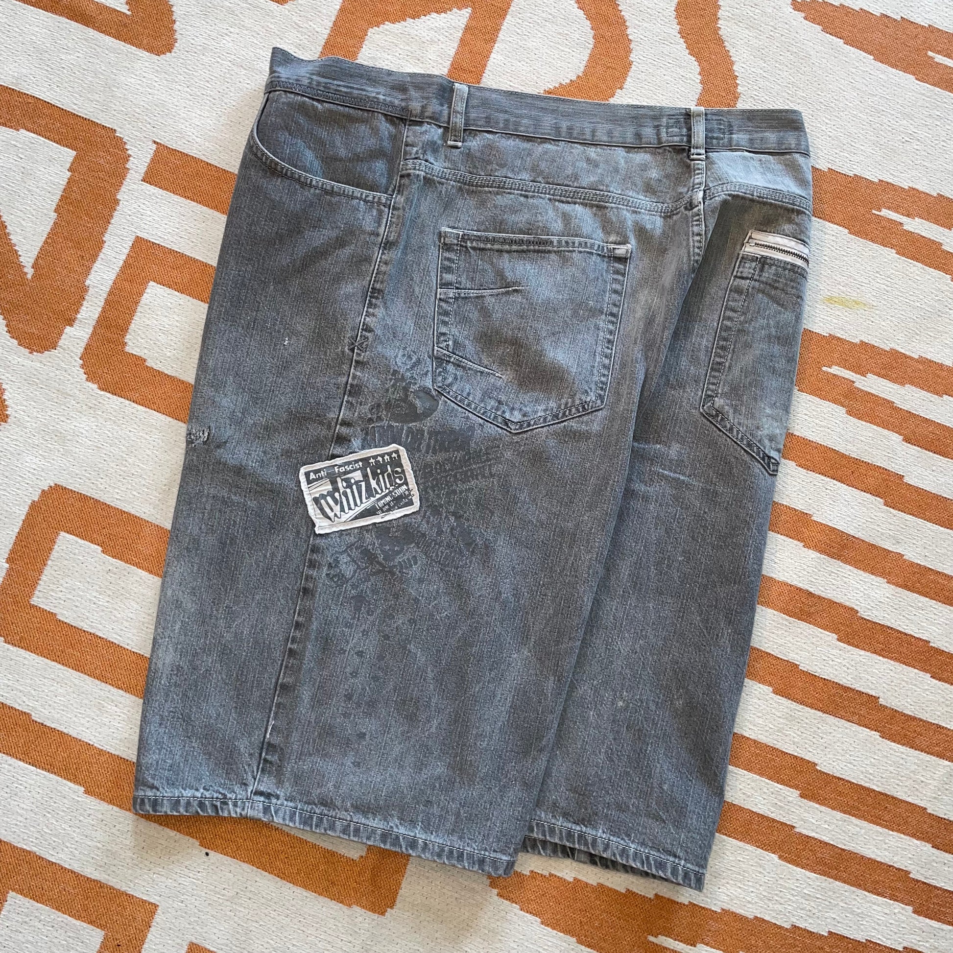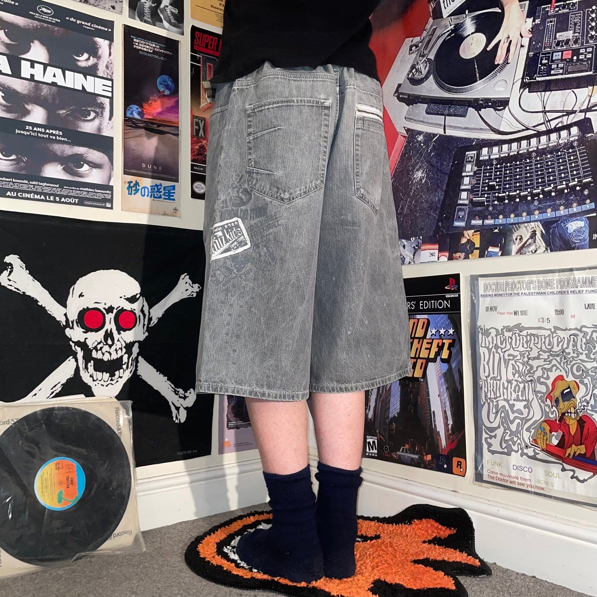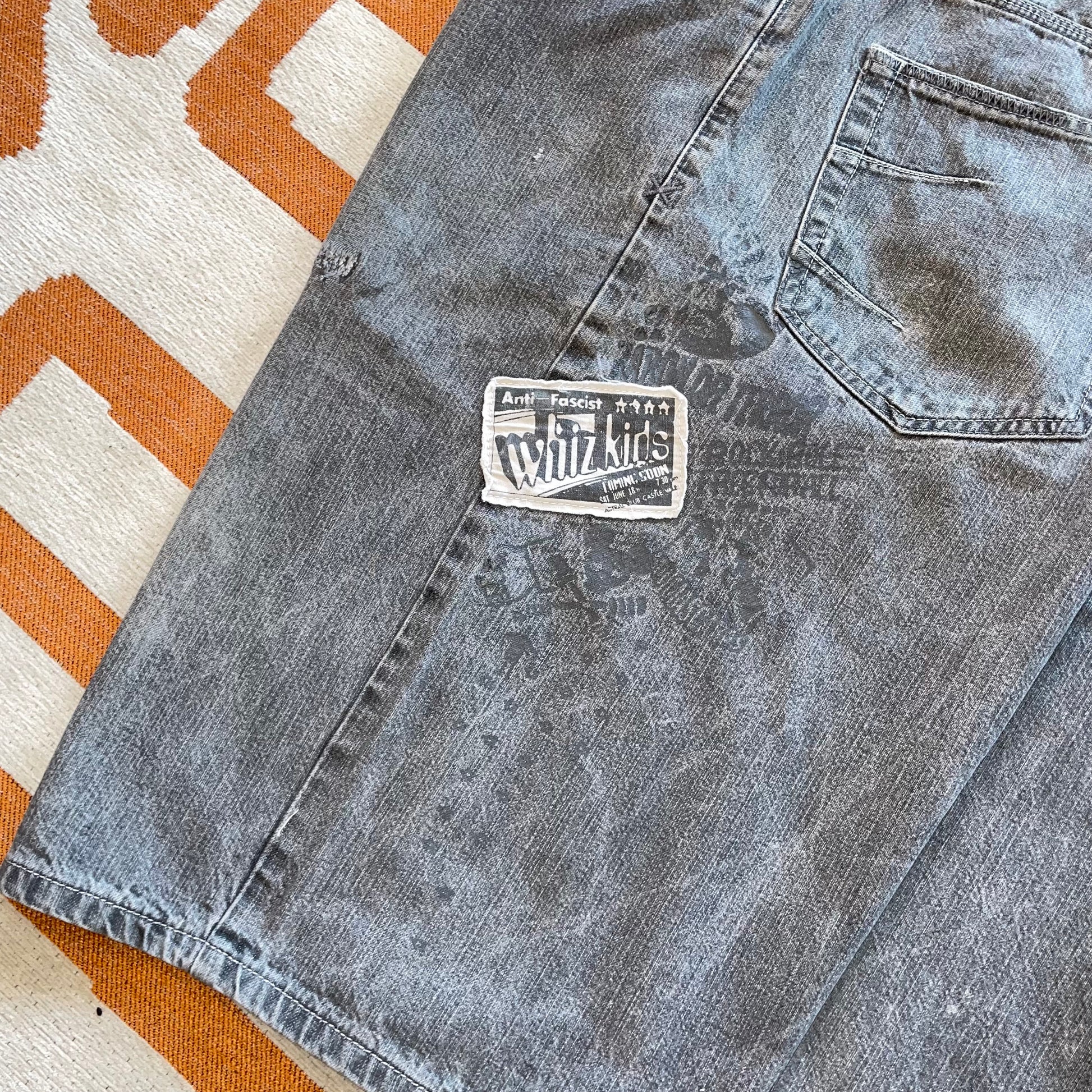 Dope 2000s Billabong jorts with ‘Anti-Facist Whiz Kids’ art design on leg/back and cool patches. Iconic y2k streetwear brand.