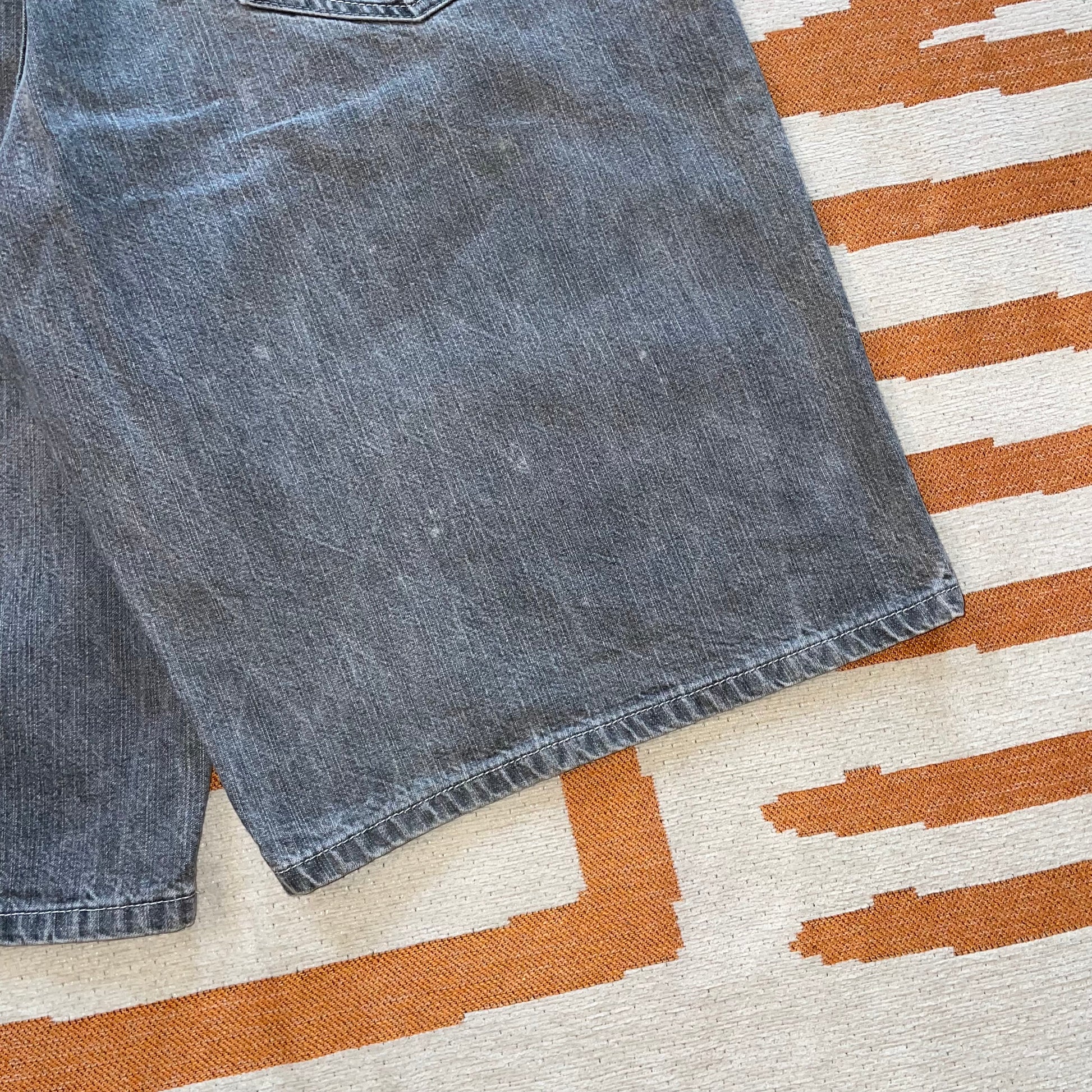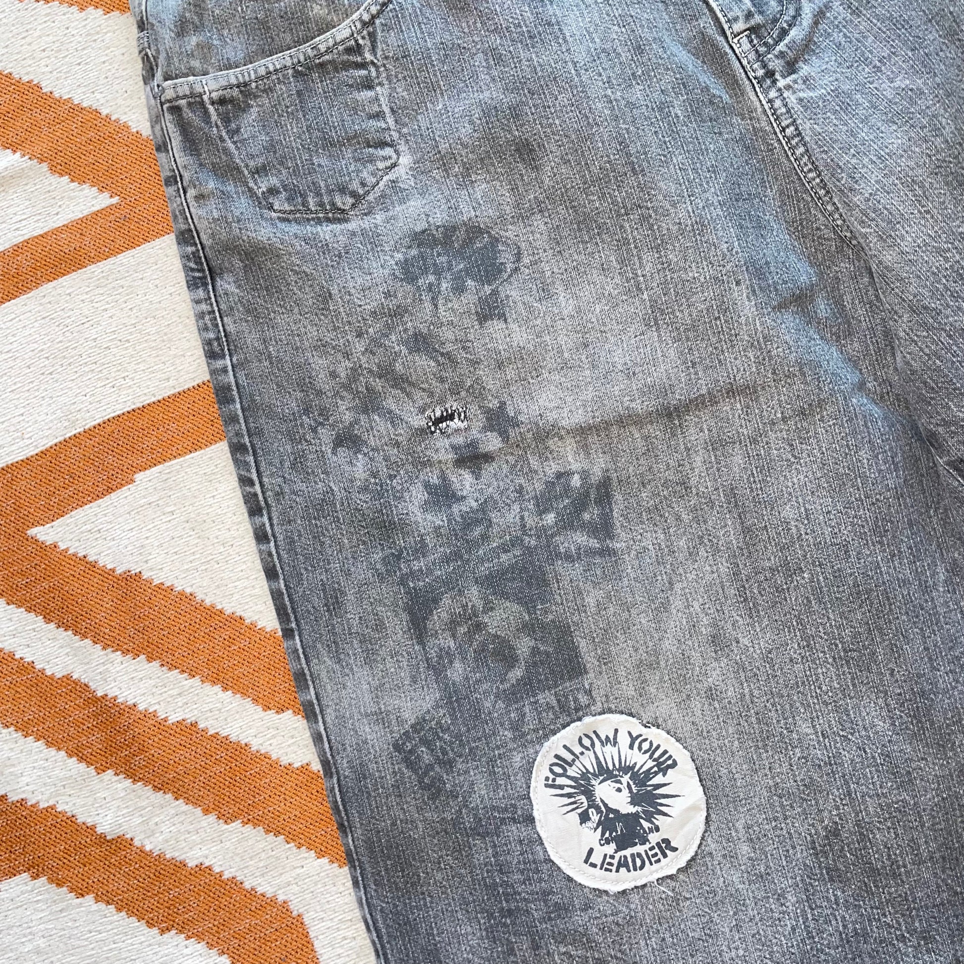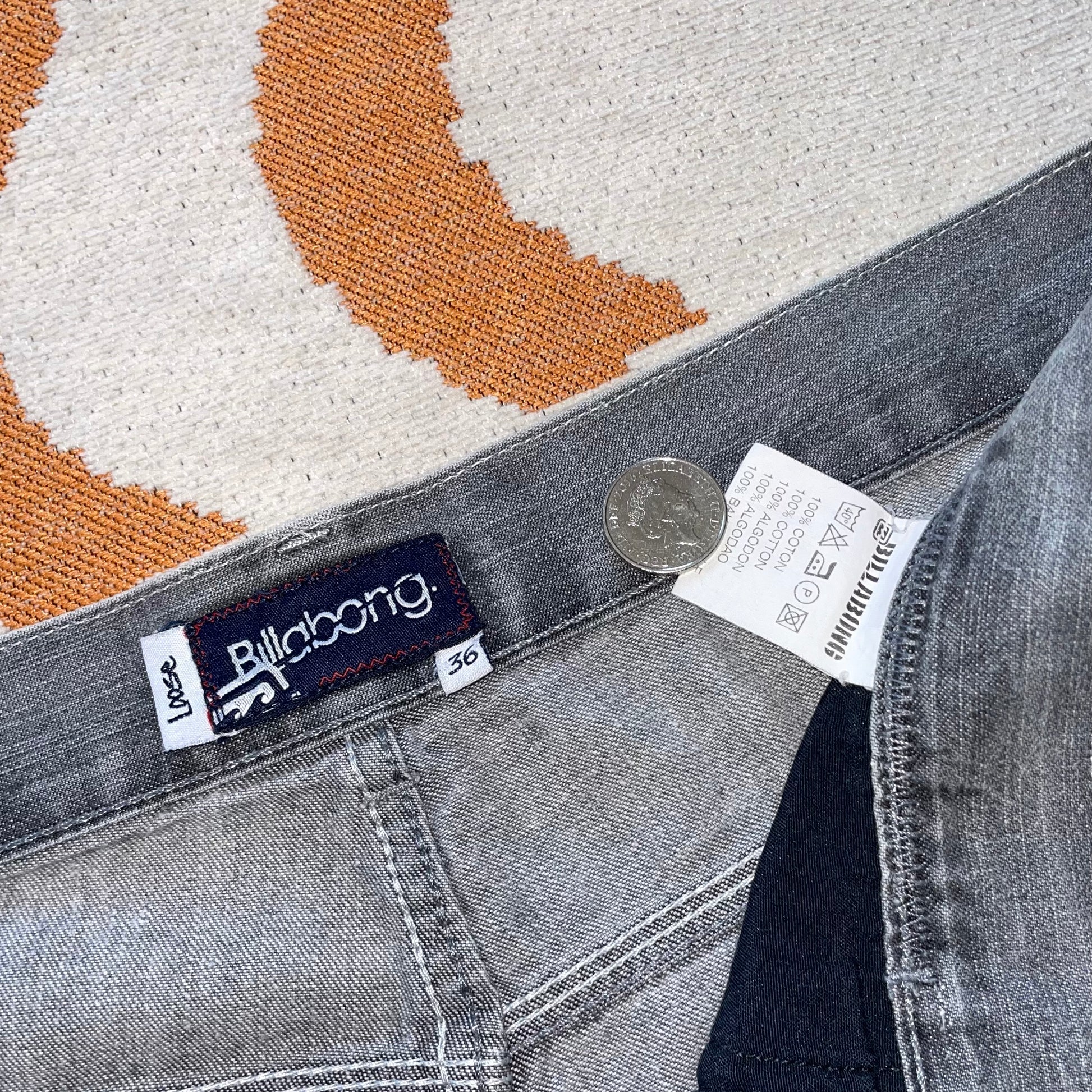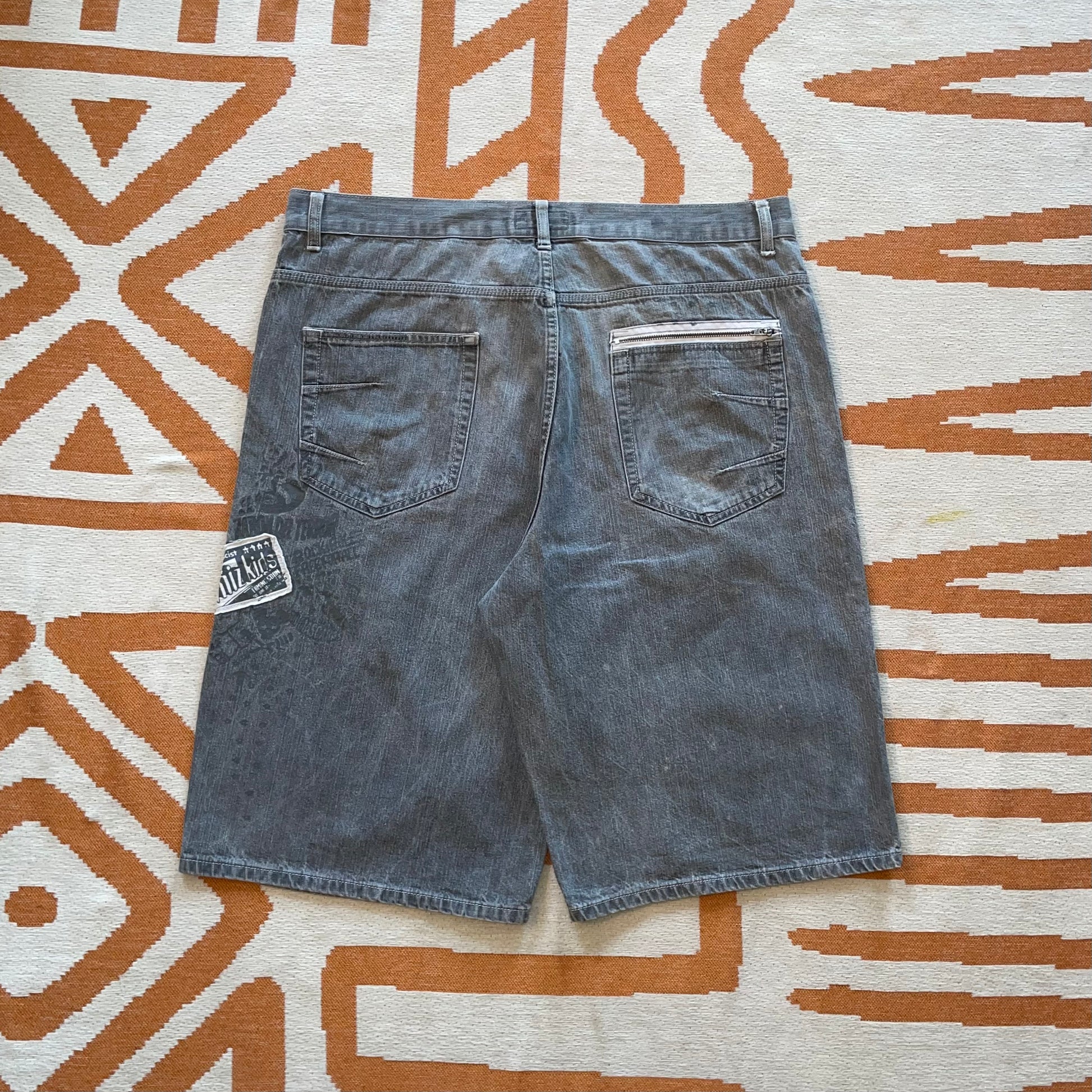 Dope 2000s Billabong jorts with ‘Anti-Facist Whiz Kids’ art design on leg/back and cool patches. Iconic y2k streetwear brand.