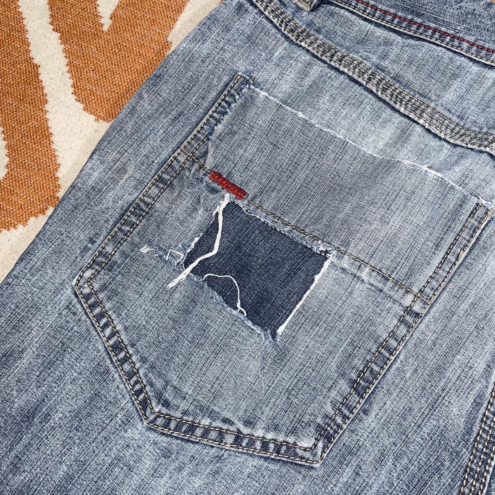 Good used condition. Large cutout hole in back pocket, distress/repairs on back pockets and cuffs.