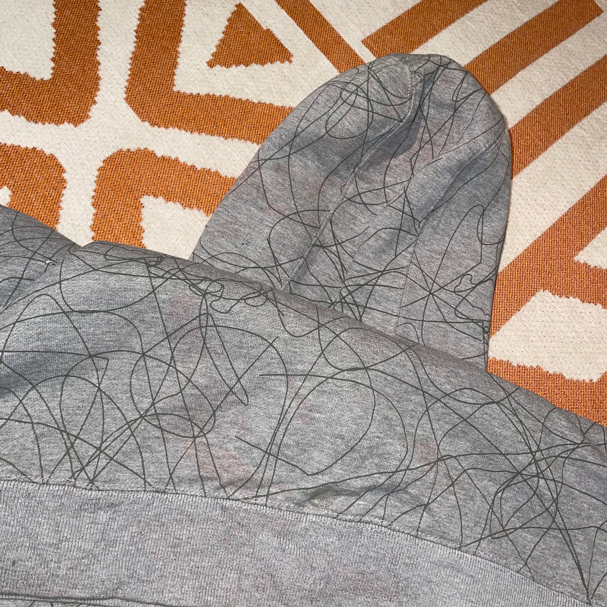 Minor print wear, missing drawstring, pinhole on pocket, light pink marks on hood/back. Bracket on chest decal partly detached.