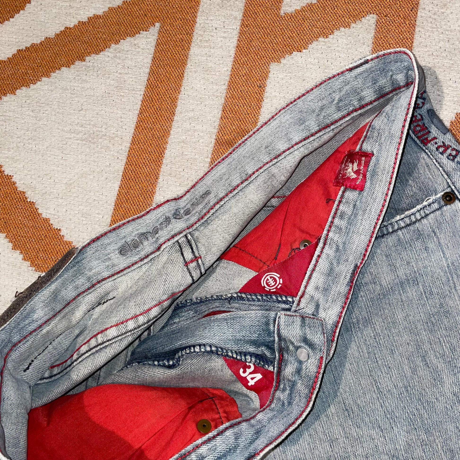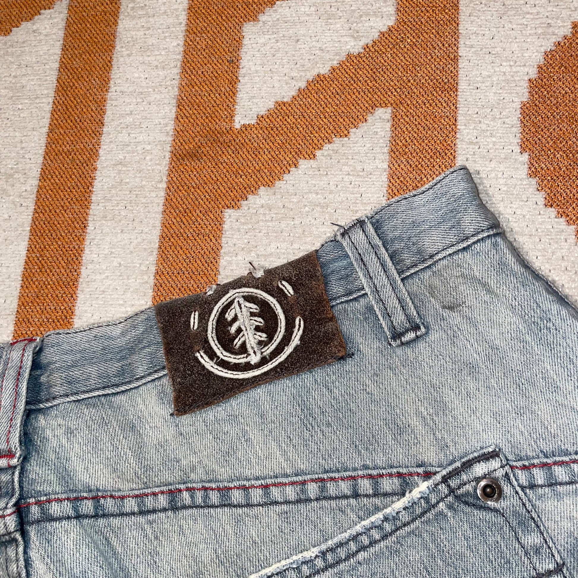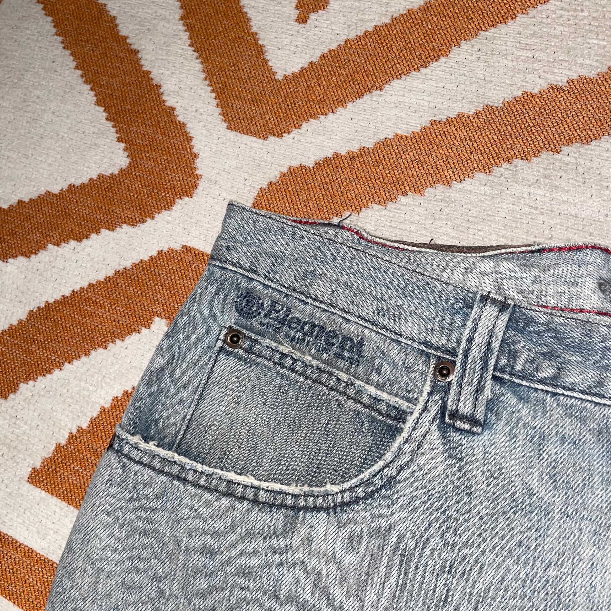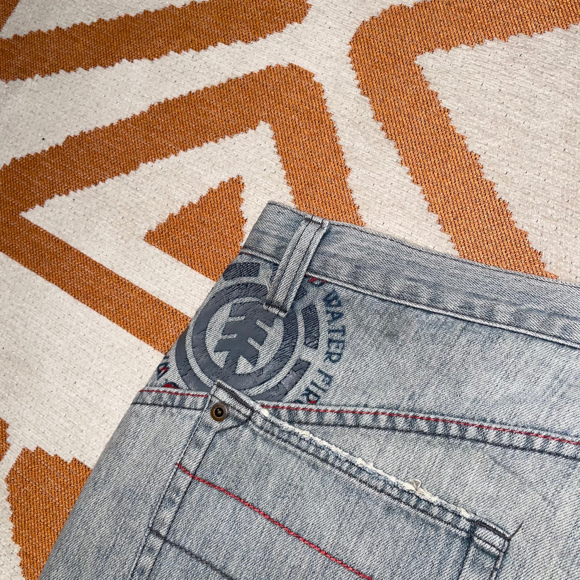 Sick 2000s Element Skate denim shorts with printed/embroidered decals on front and back and baggy 90s-style fit. Classic Y2k skate brand.