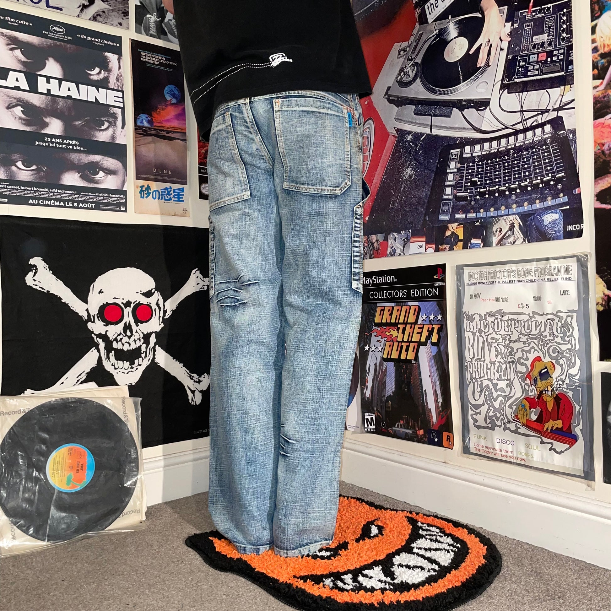 Nice 2000s Gems Baby jeans with britpop-themed embroidery over front and loose fit. Iconic y2k streetwear. Unique pocket design.