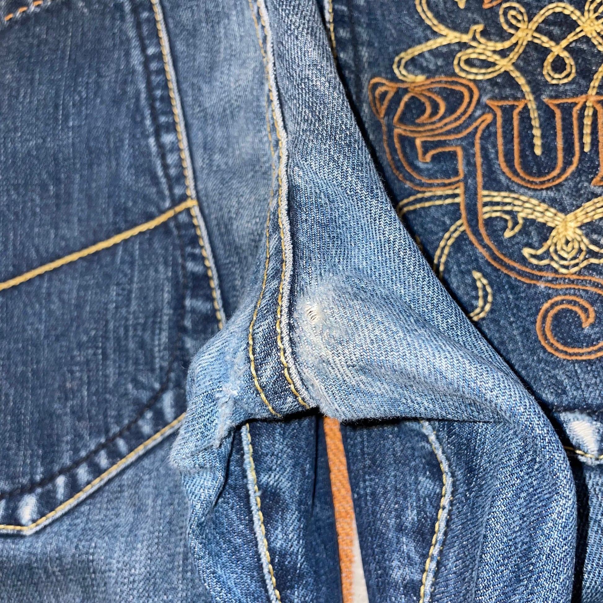 Sickk 2000s Guru jeans with embroidered crest on back pocket and loose/straight fit. Awesome y2k streetwear.