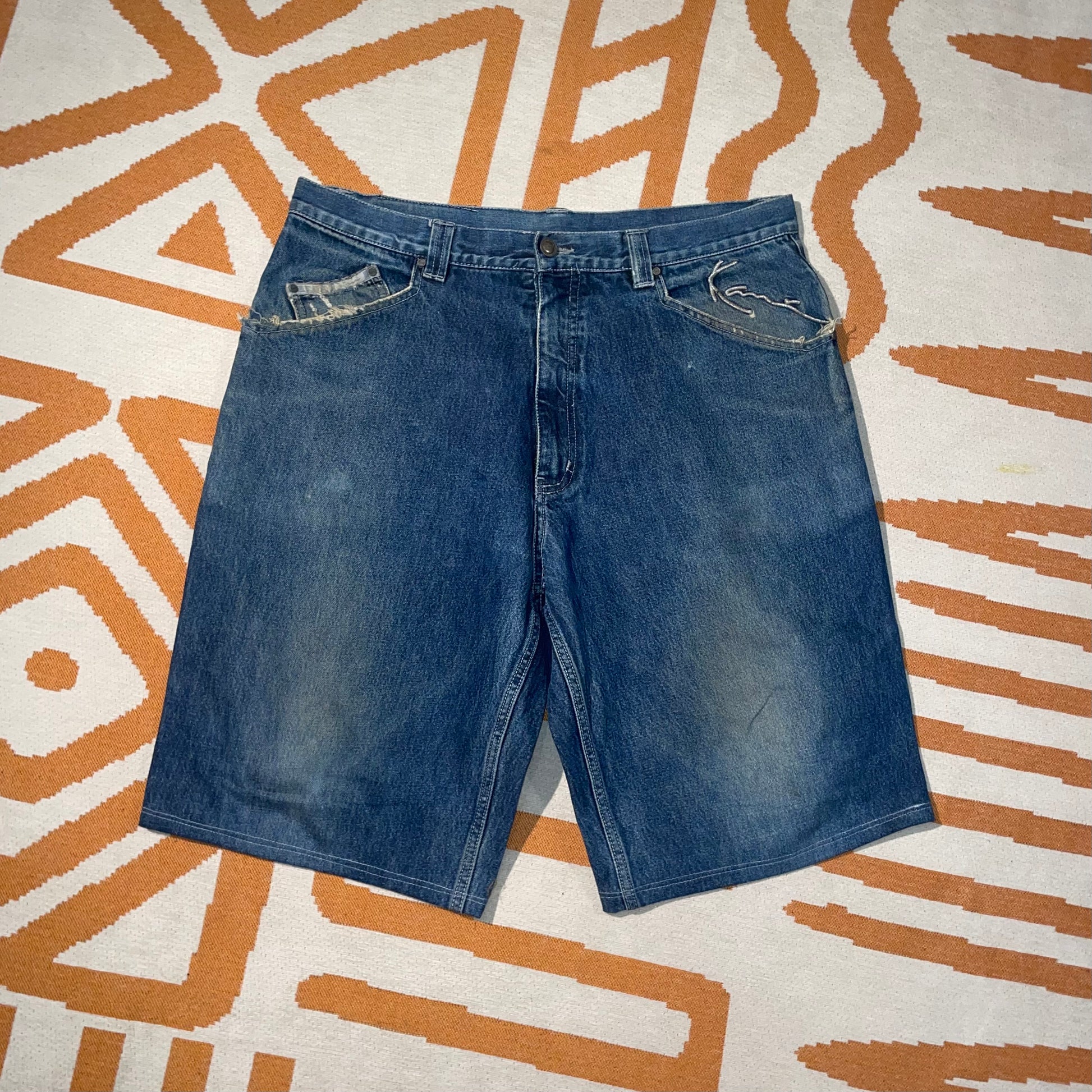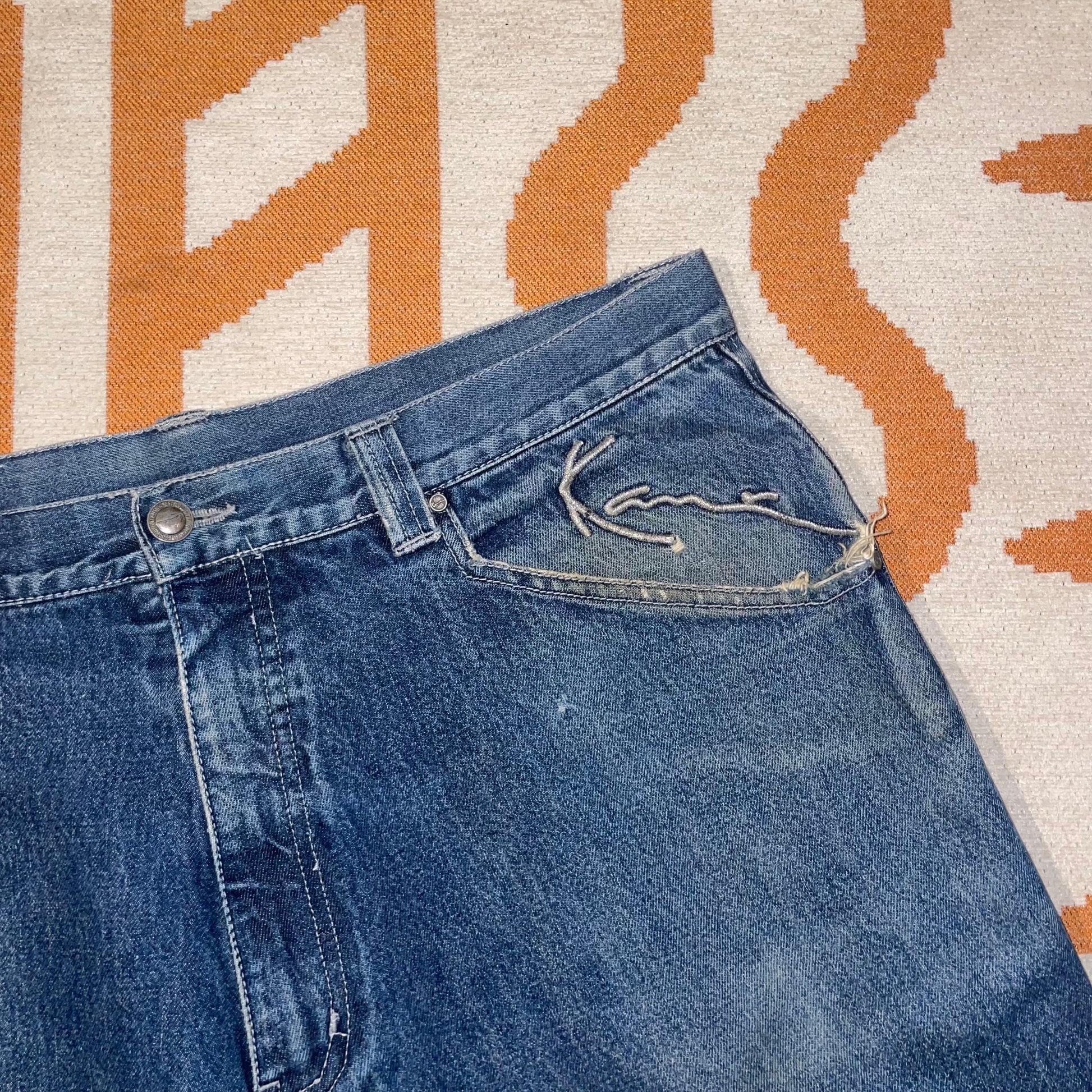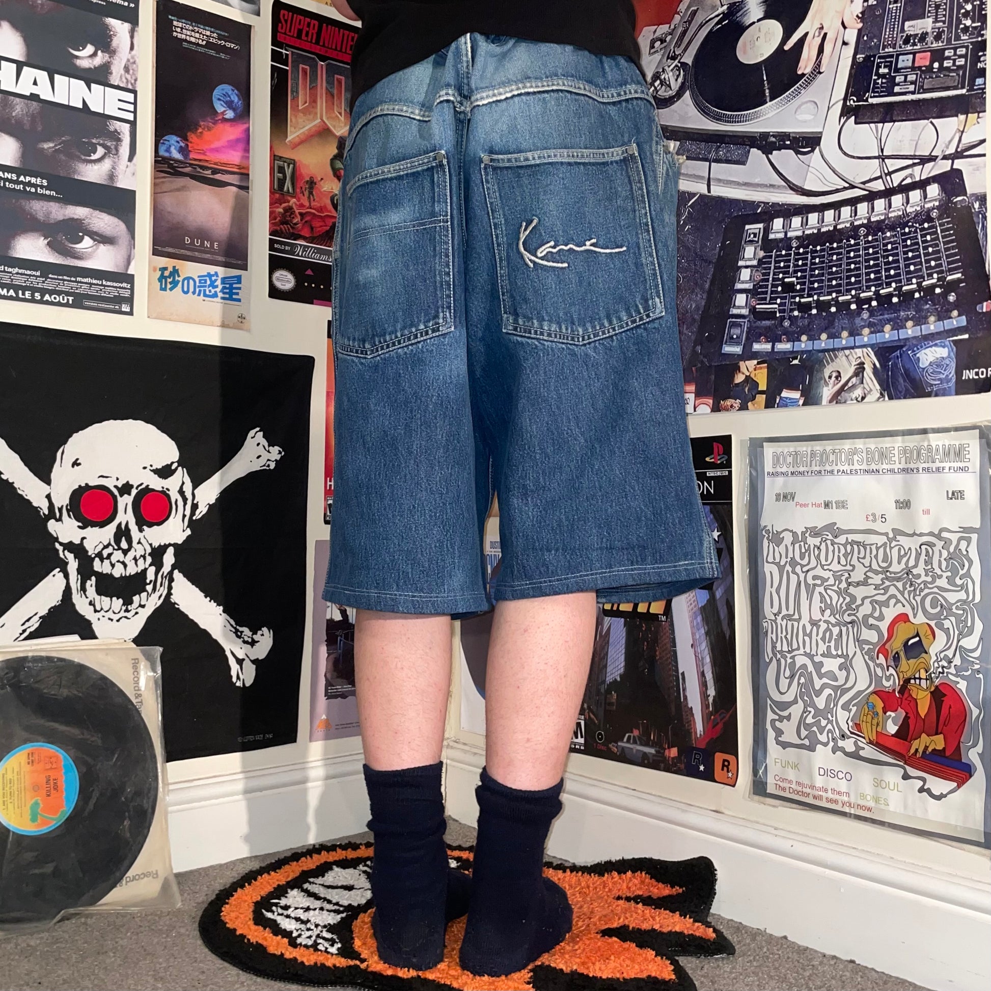 Dope 1990s Karl Kani denim shorts with embroidered signature in silver stitching on back pocket and baggy knee-length fit. Classic 90s/y2k streetwear brand.