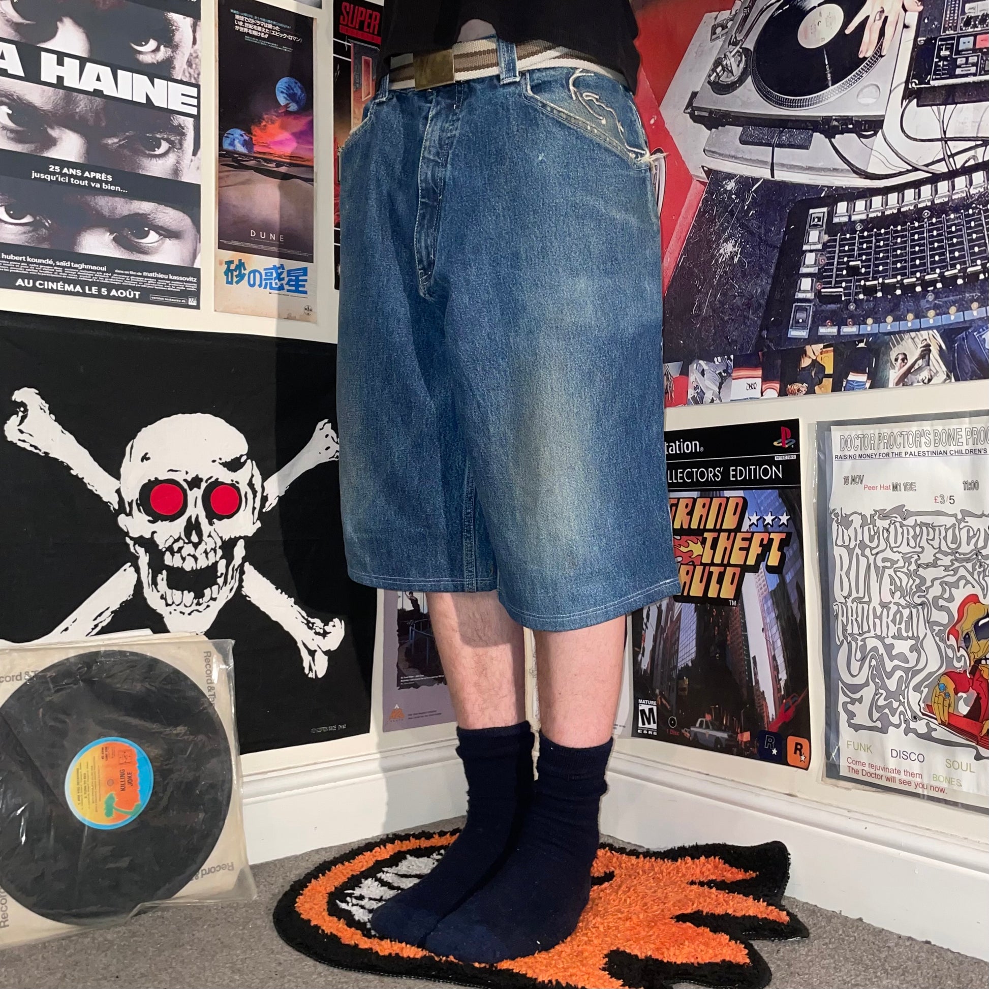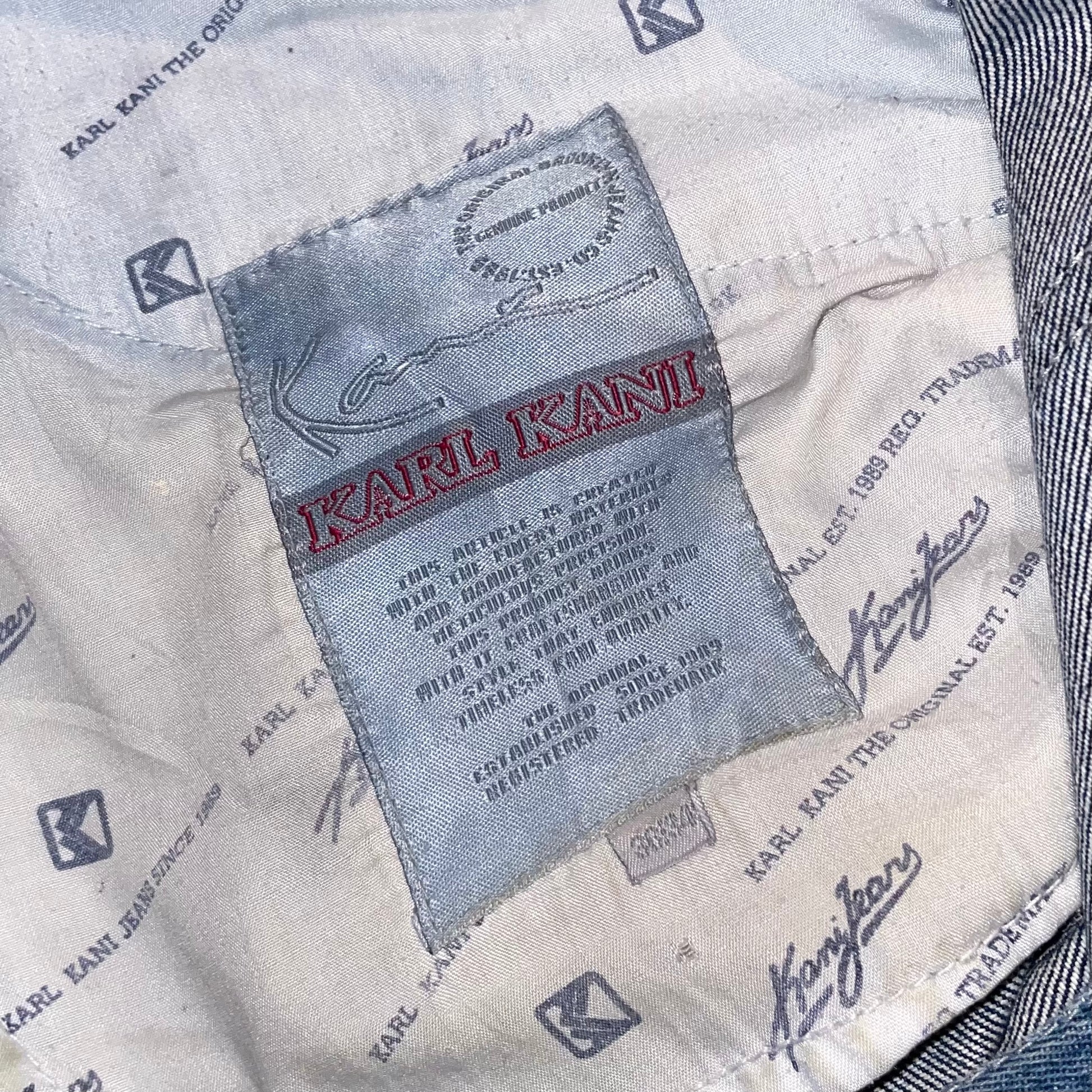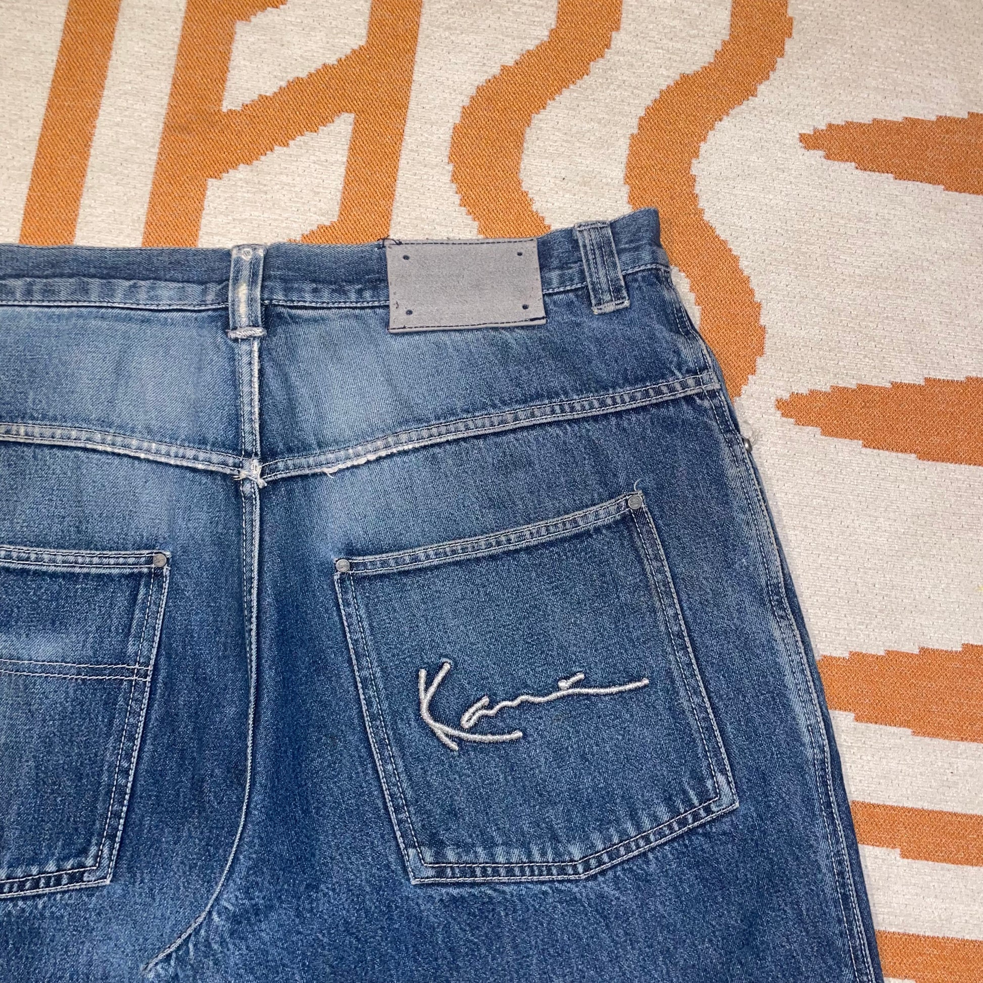 Dope 1990s Karl Kani denim shorts with embroidered signature in silver stitching on back pocket and baggy knee-length fit. Classic 90s/y2k streetwear brand.