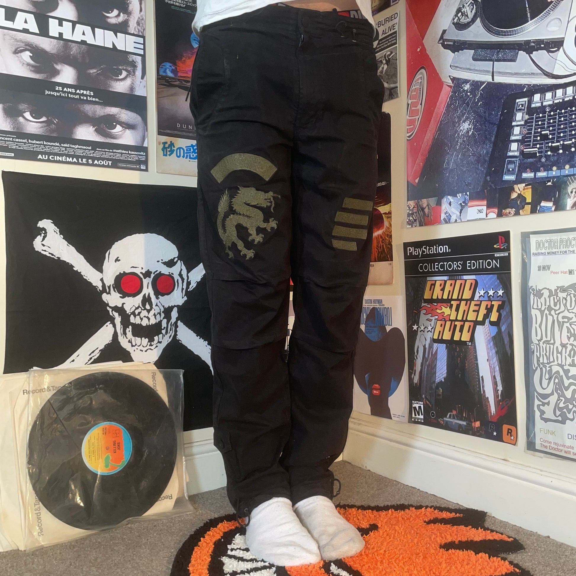 Nice 2000s Maharishi parachute pants with embroidered dragon decal on front and slim fit. Light breathable material. Super good quality.