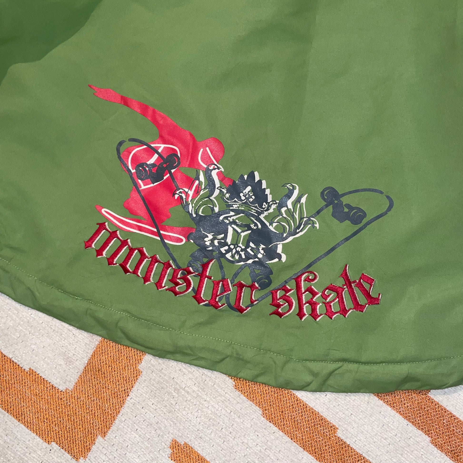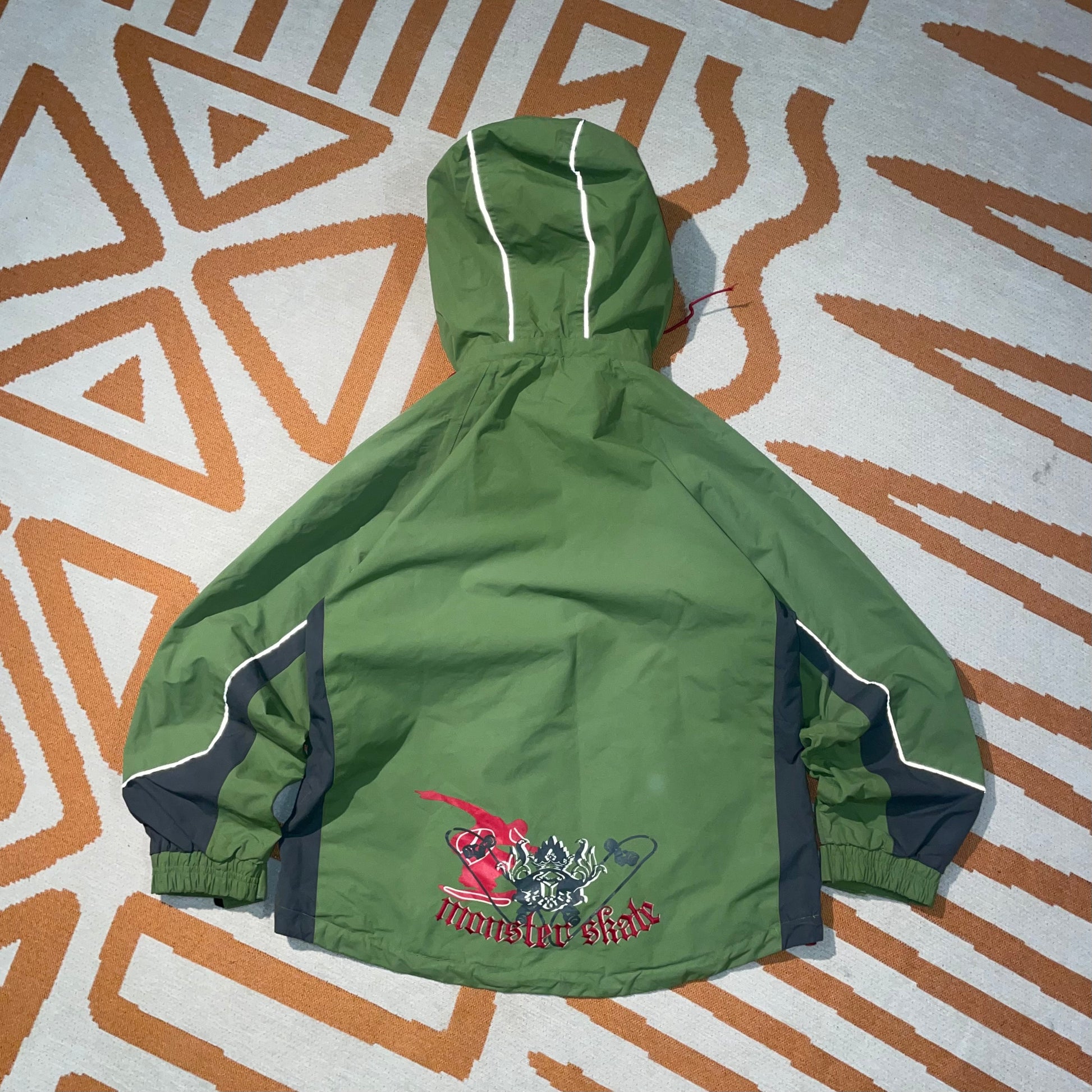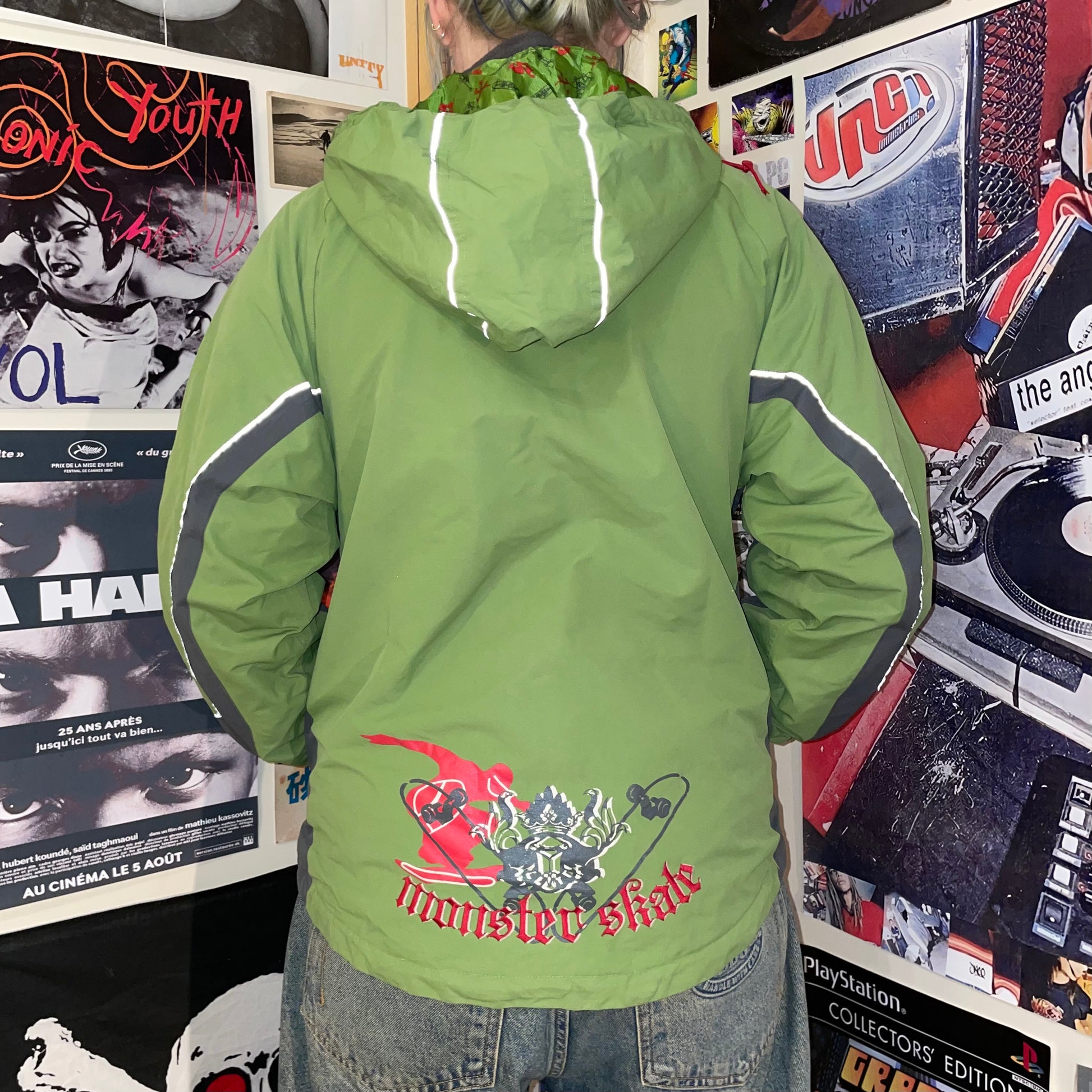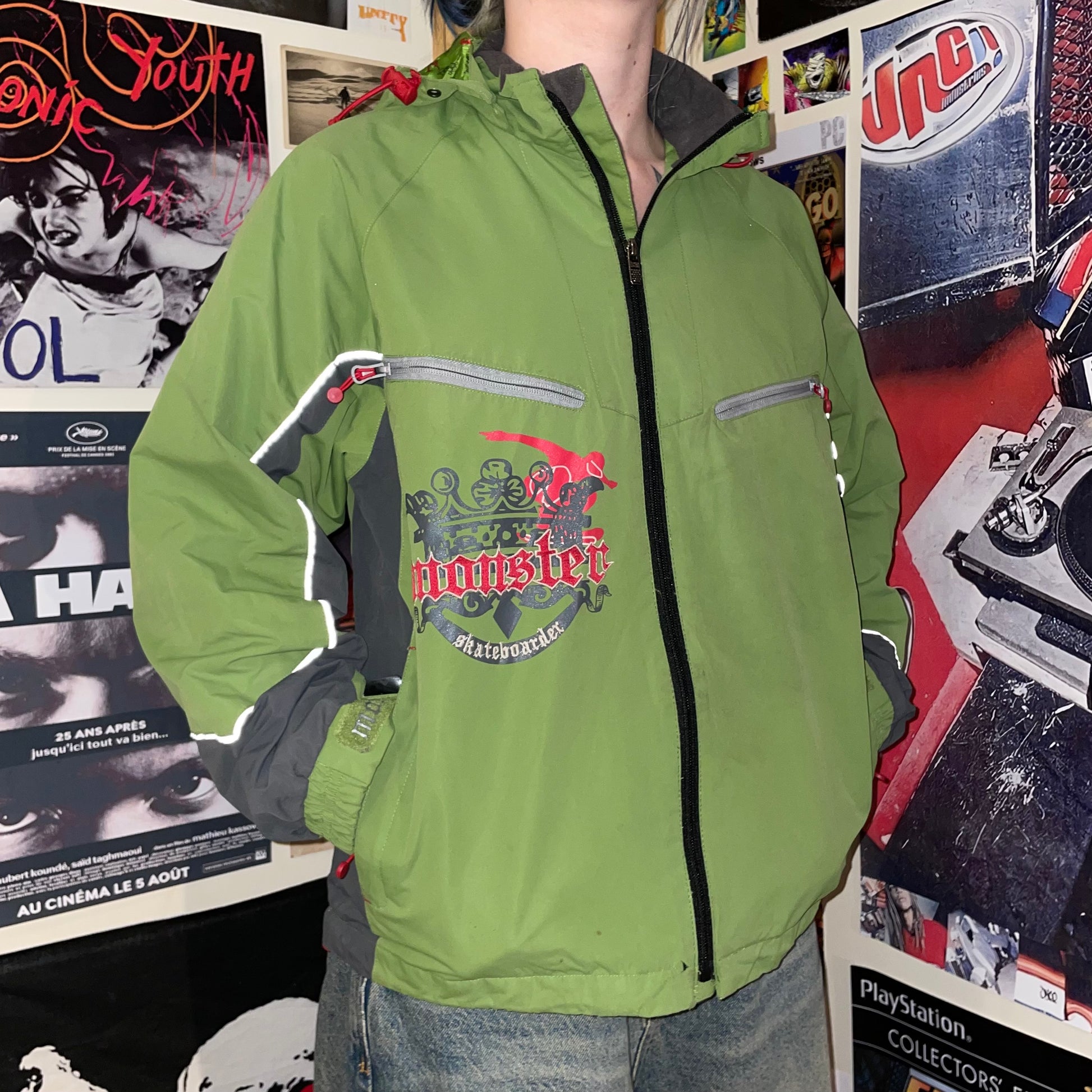 Sick 2000s Monster coat with green panelling and embroidery/prints on front and back. Really unique coat.