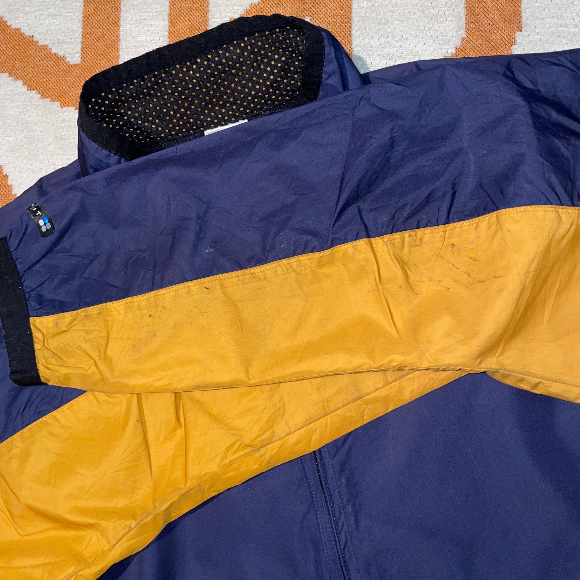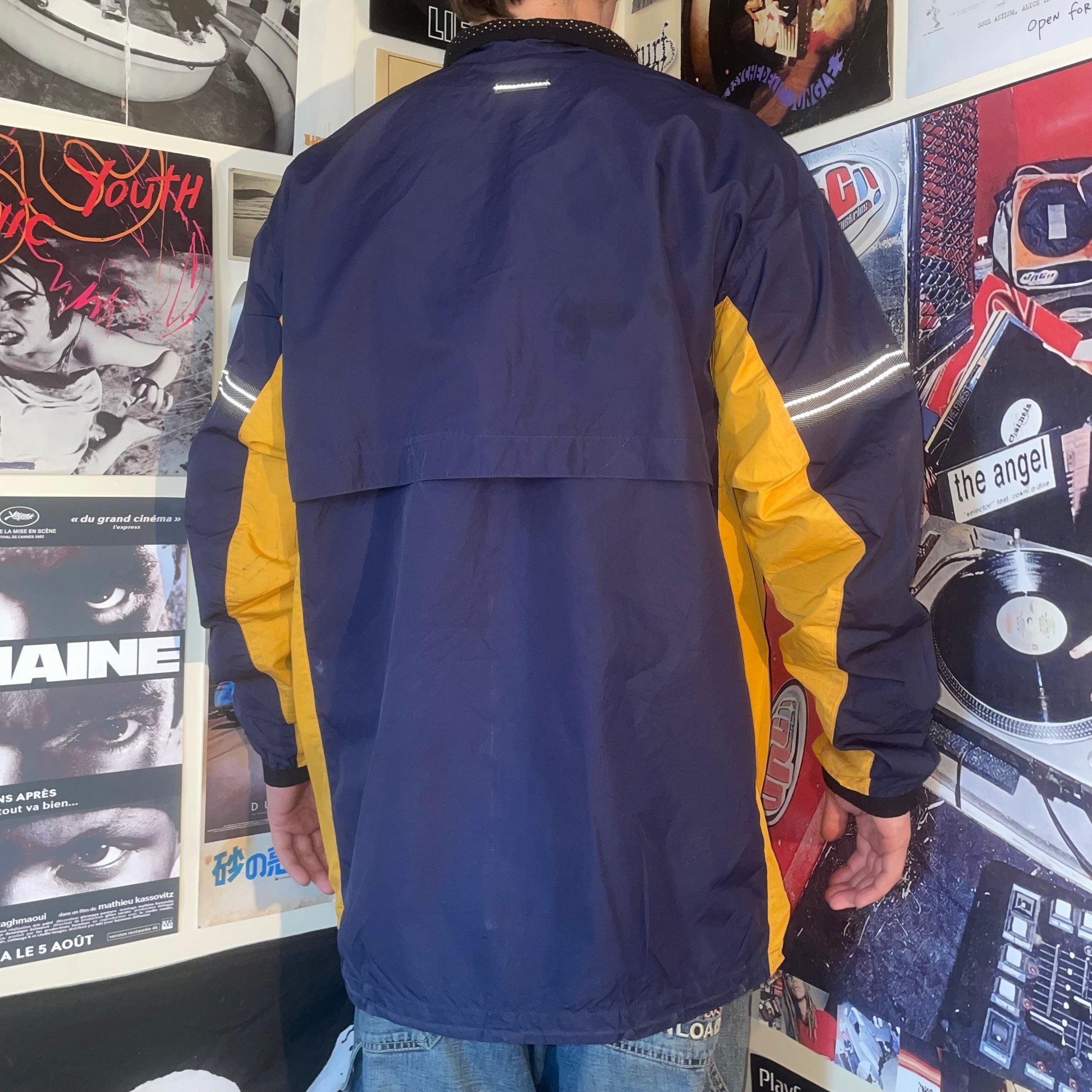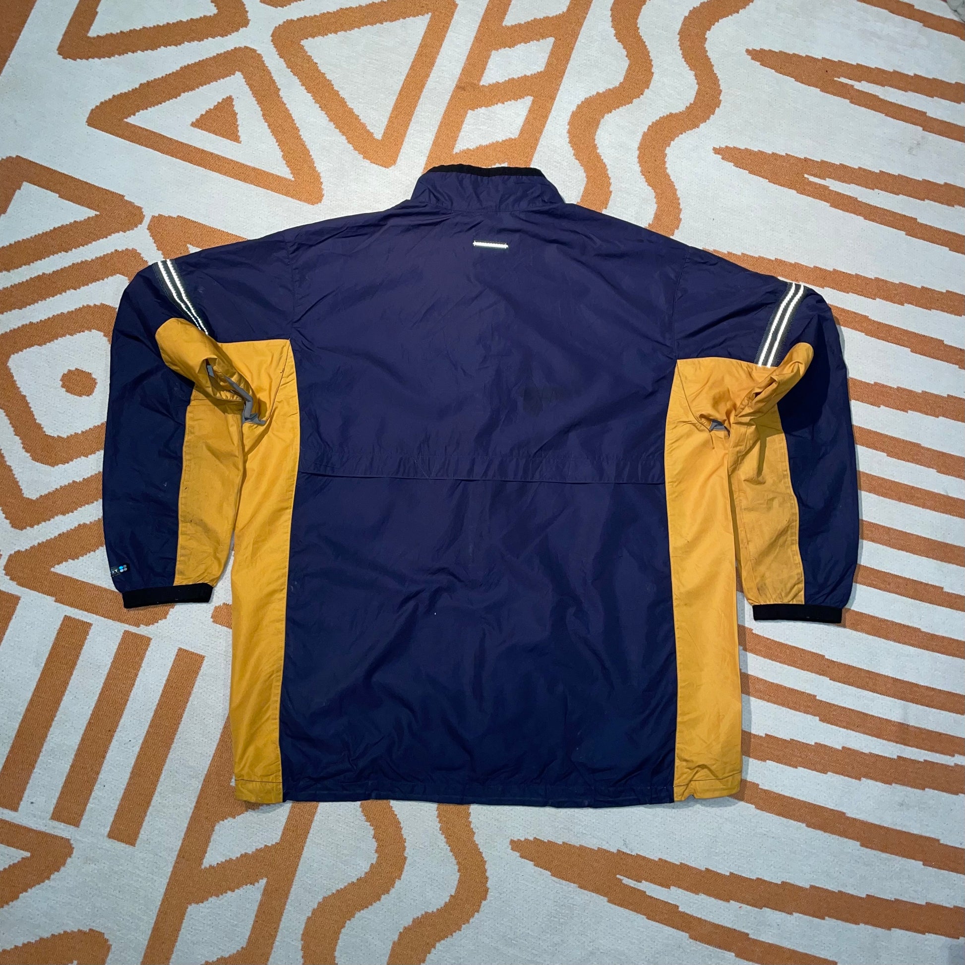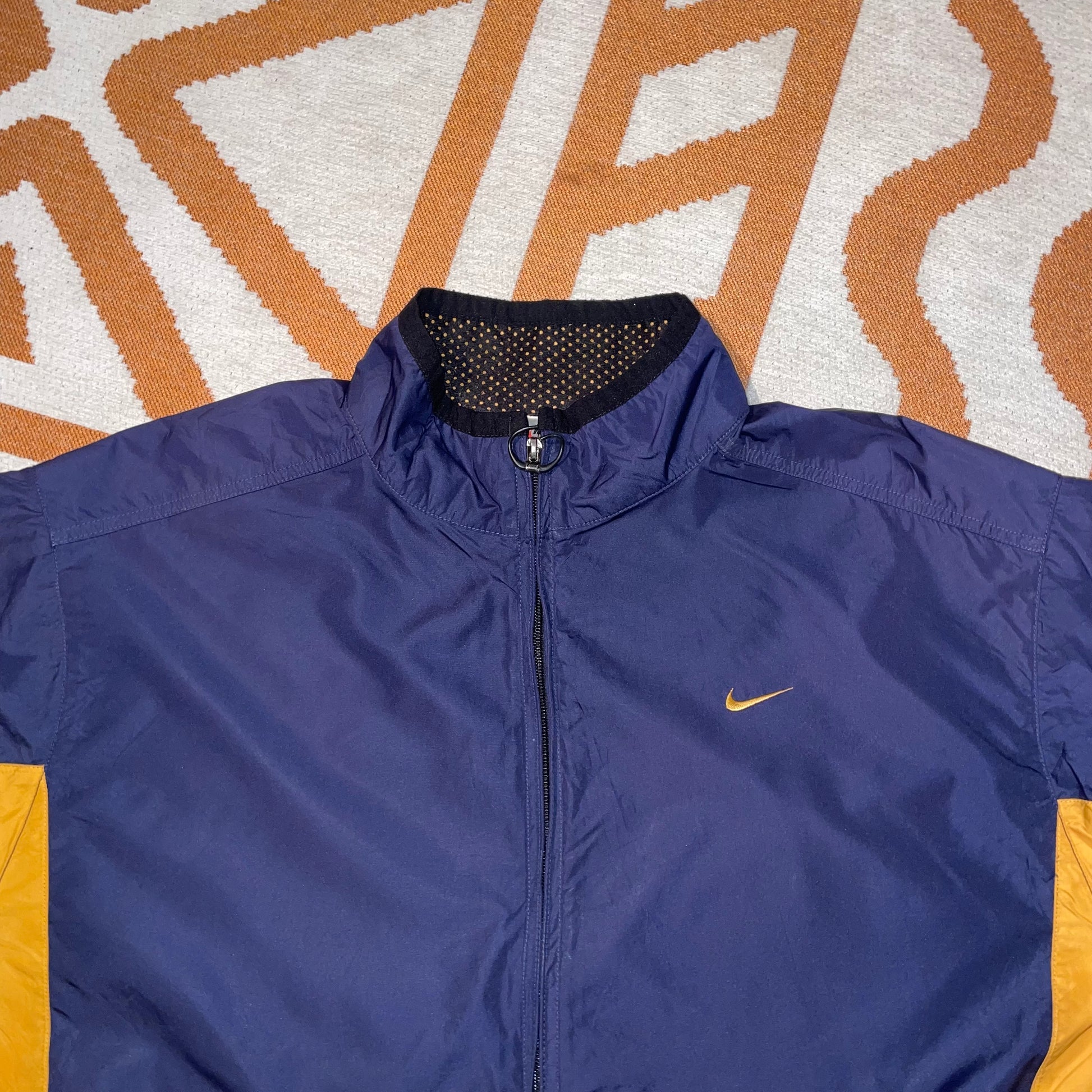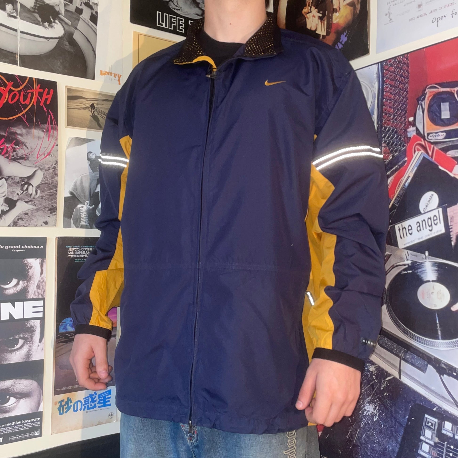 Cool 1990s Nike windbreaker with clean blue/yellow panelling and swoosh on chest. Light floaty material. Perfect for summer.