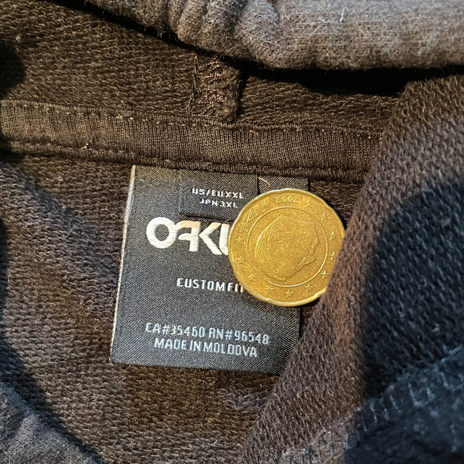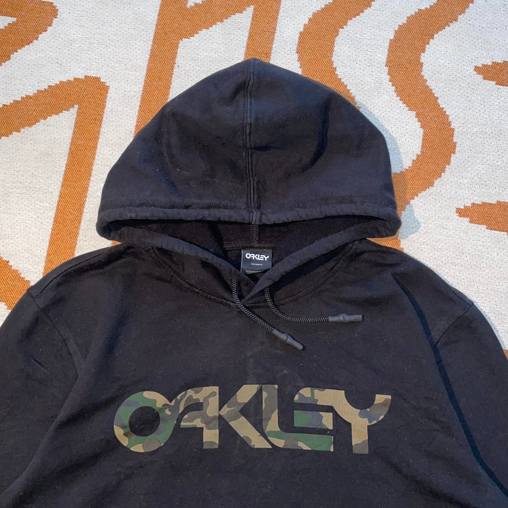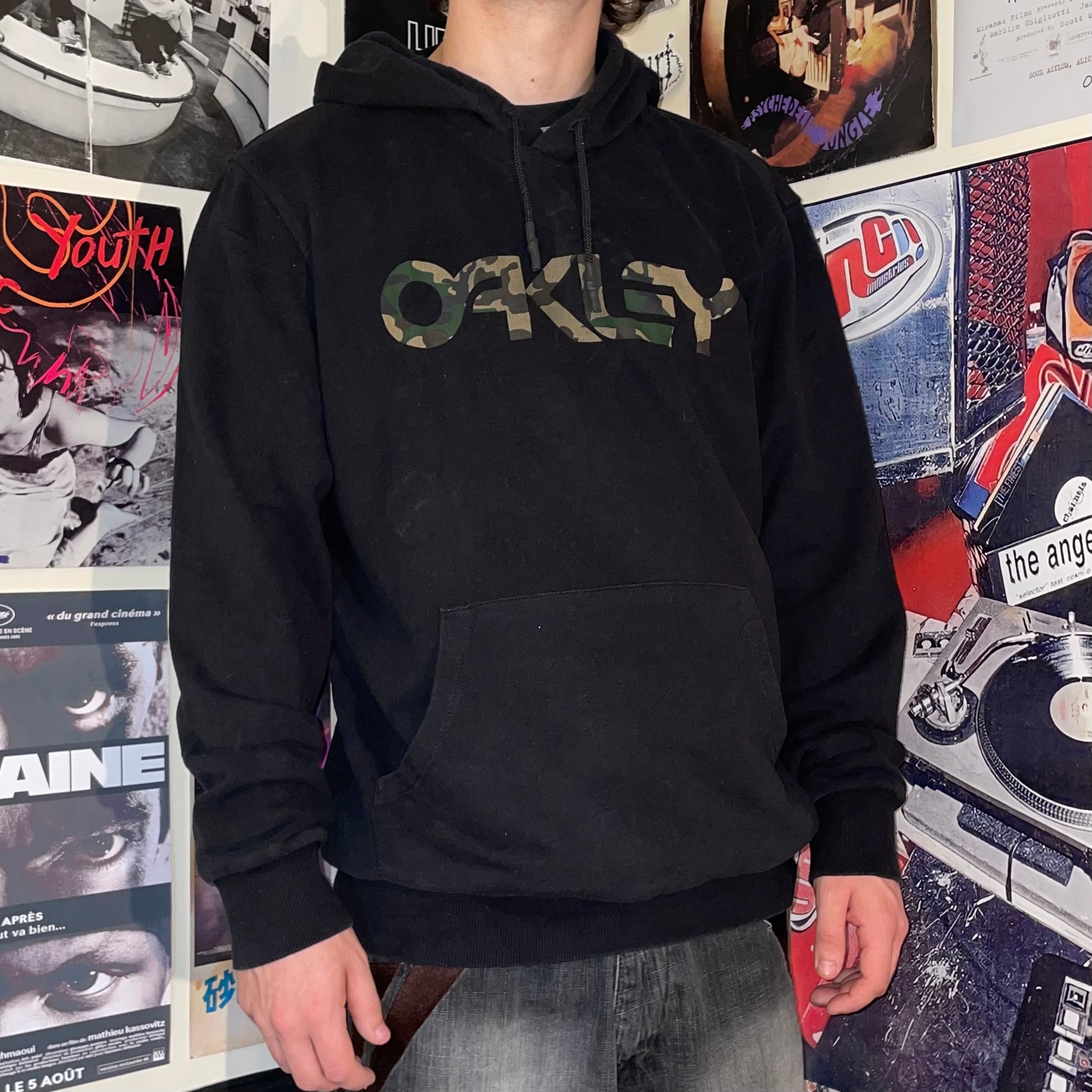 Cold 2000s Oakley hoodie with printed camo spell out across chest and baggy skater style fit. Iconic y2k techwear brand.