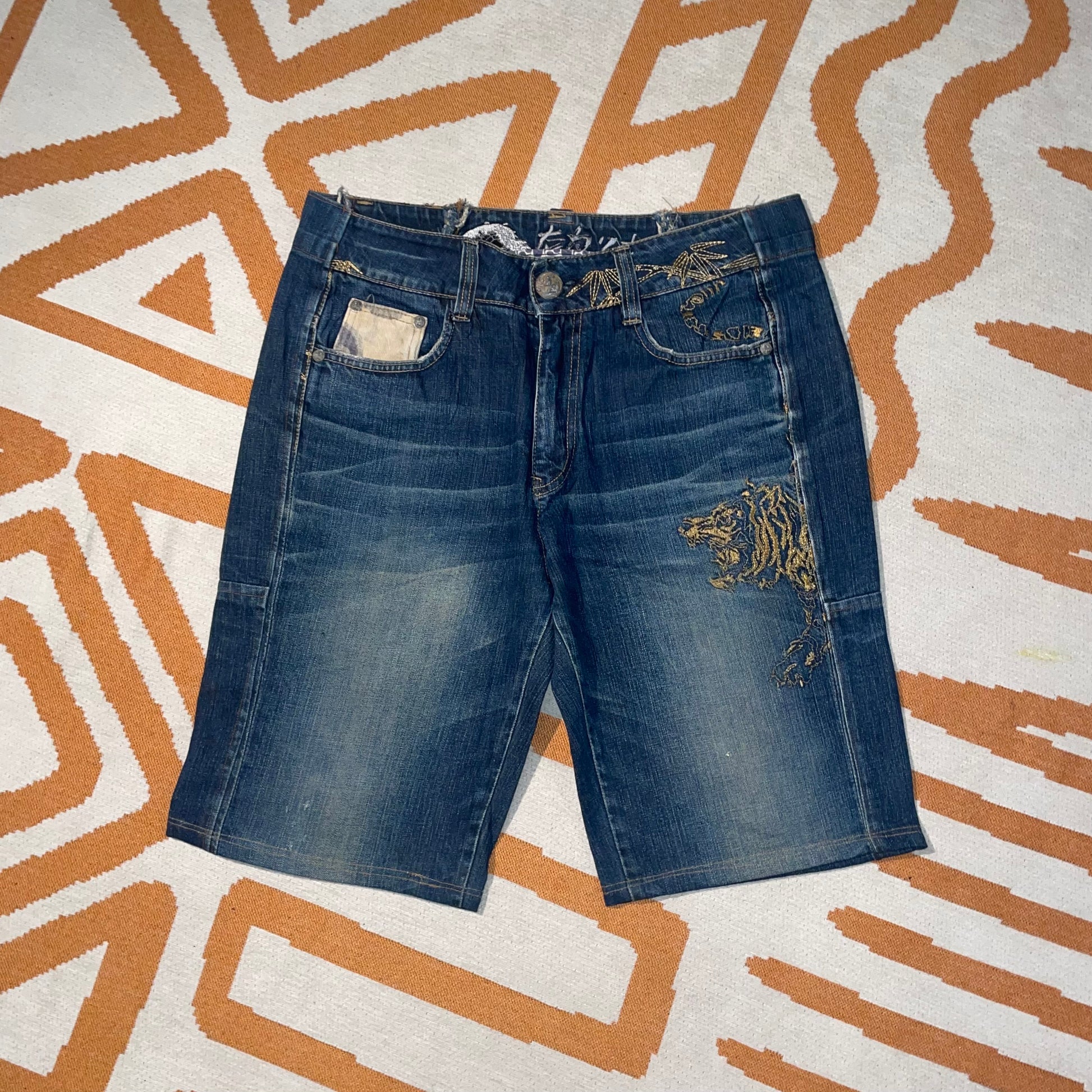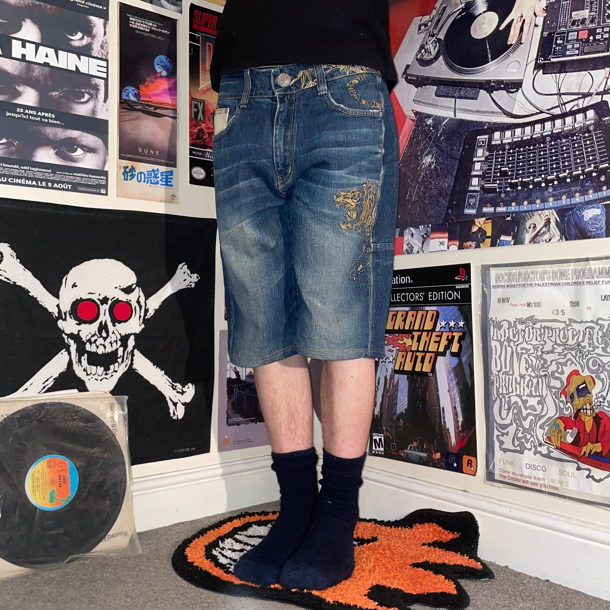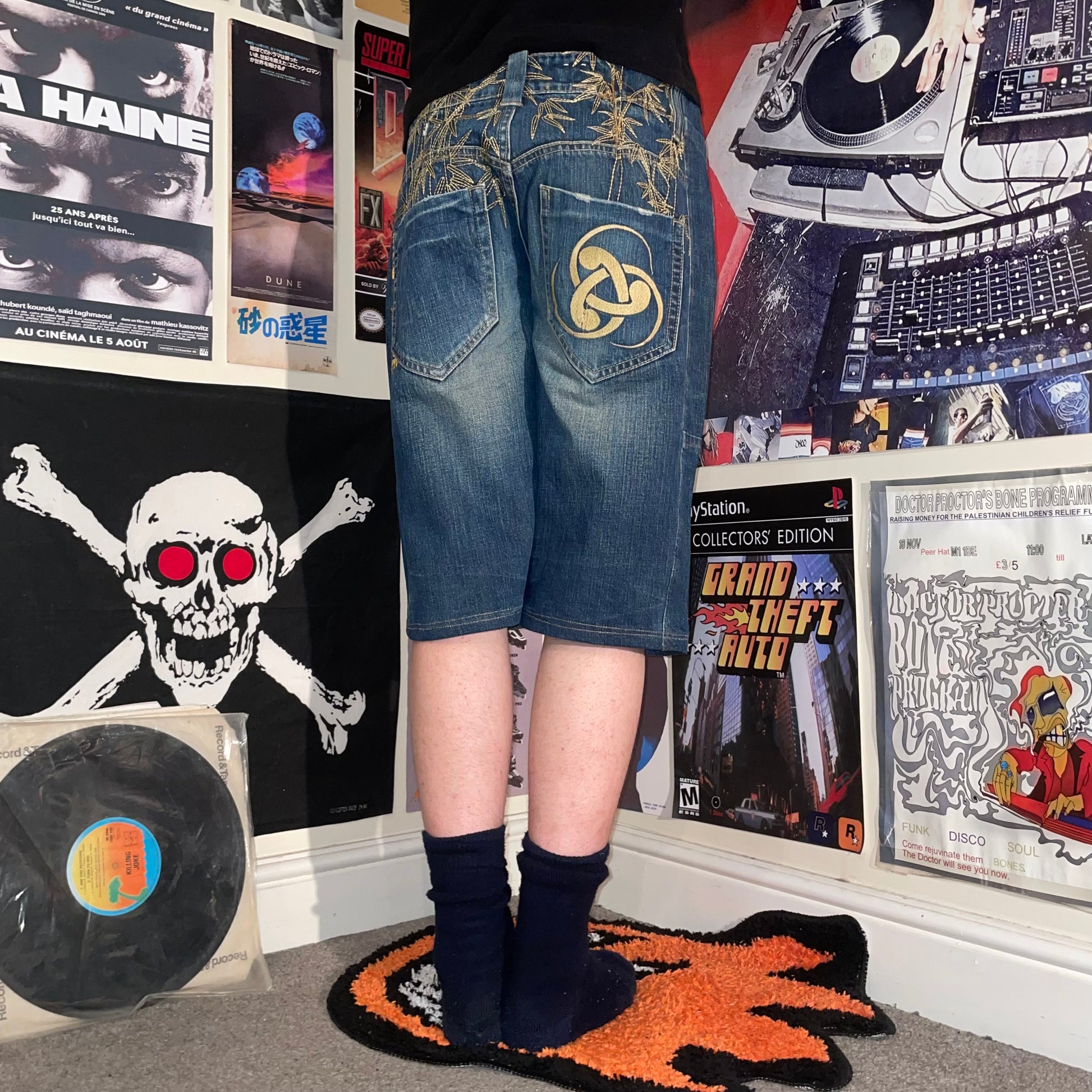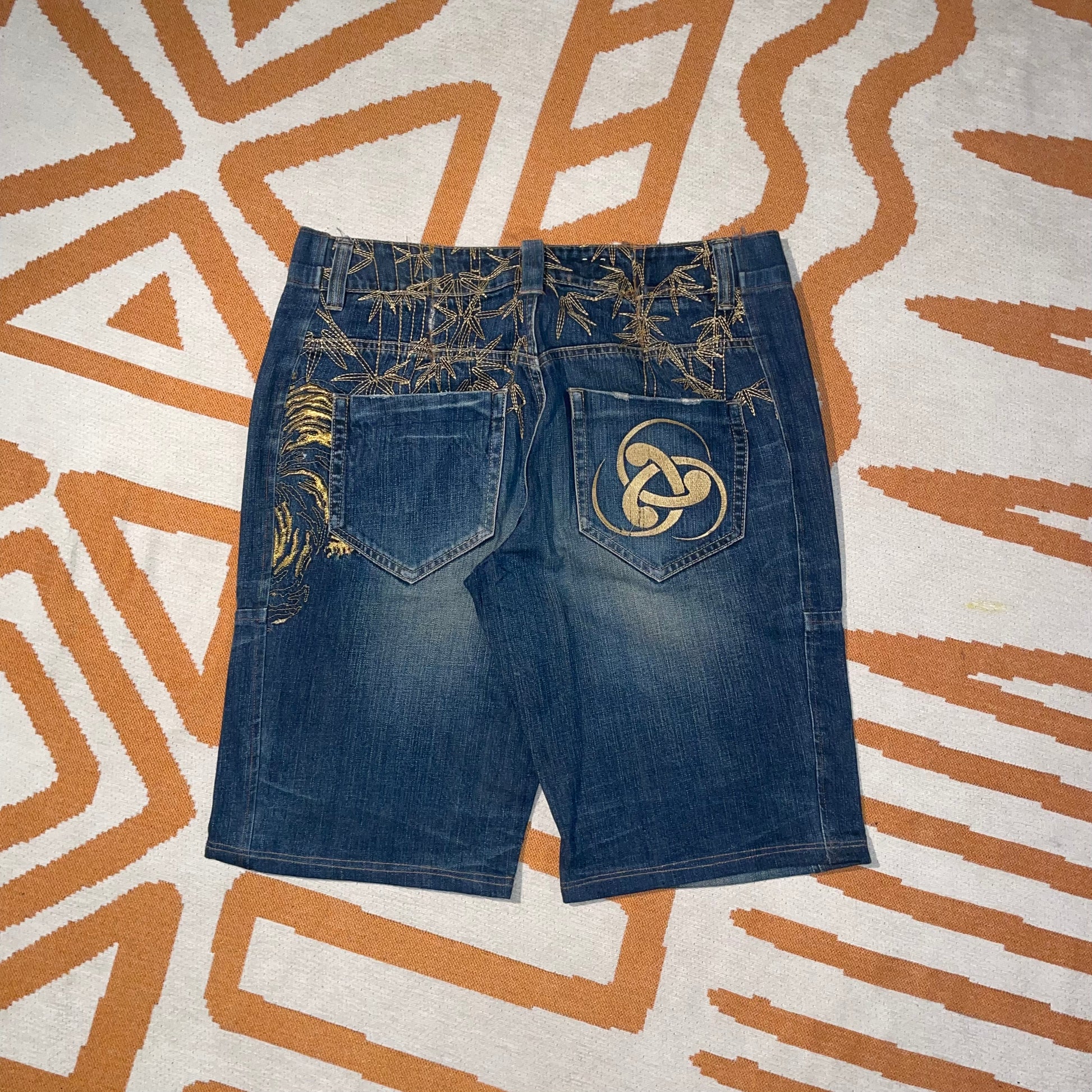 Dope 2000s OBT Japanese denim shorts with gold embroidered ‘bamboo forest/tiger’ design on front and back. Loose knee-length fit. Ideal y2k summer streetwear.