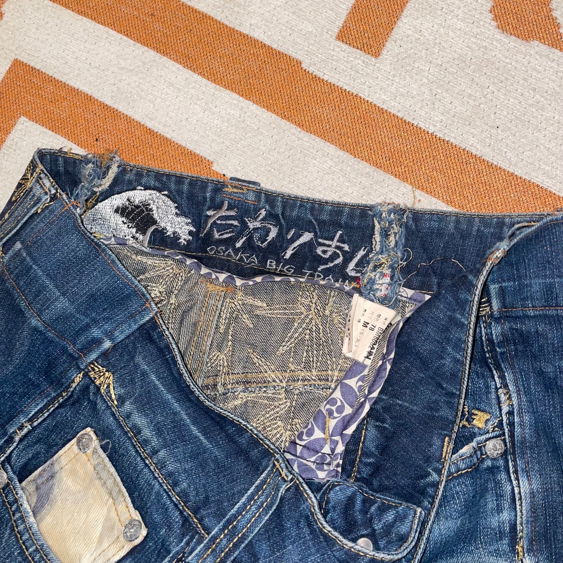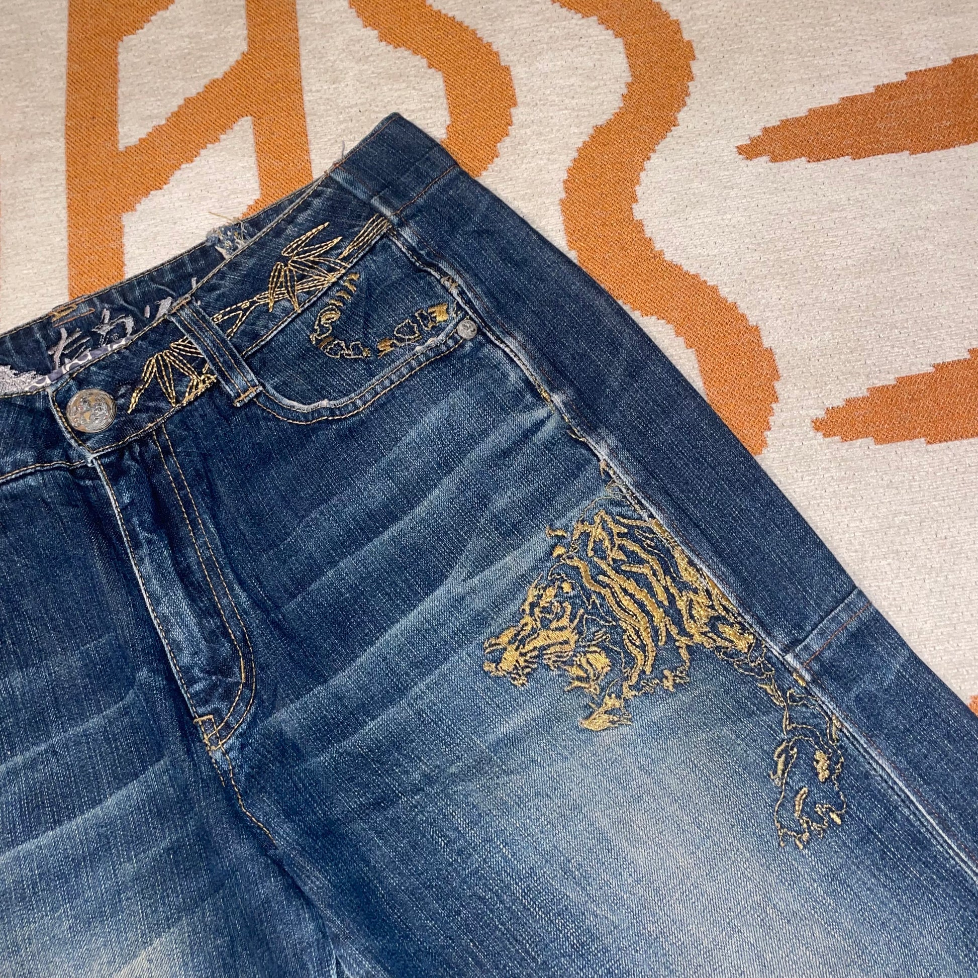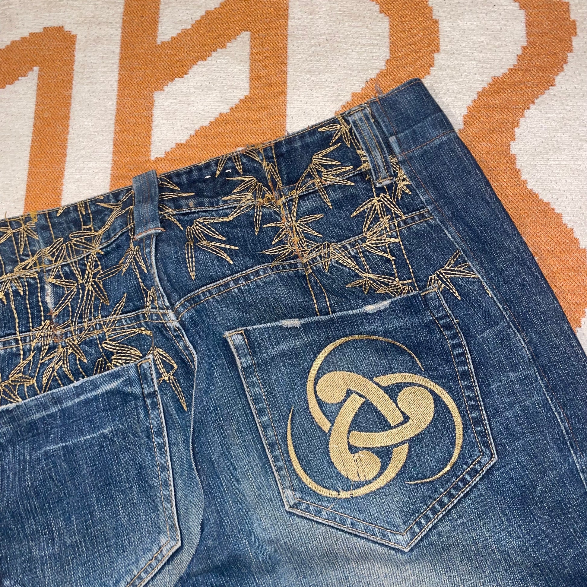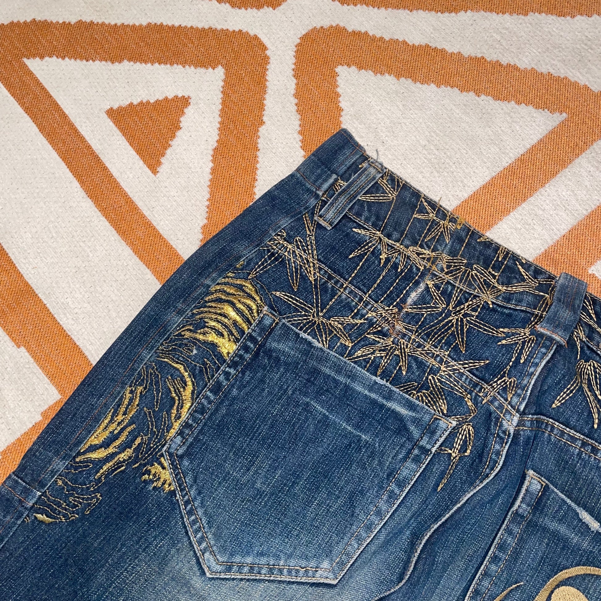 Dope 2000s OBT Japanese denim shorts with gold embroidered ‘bamboo forest/tiger’ design on front and back. Loose knee-length fit. Ideal y2k summer streetwear.