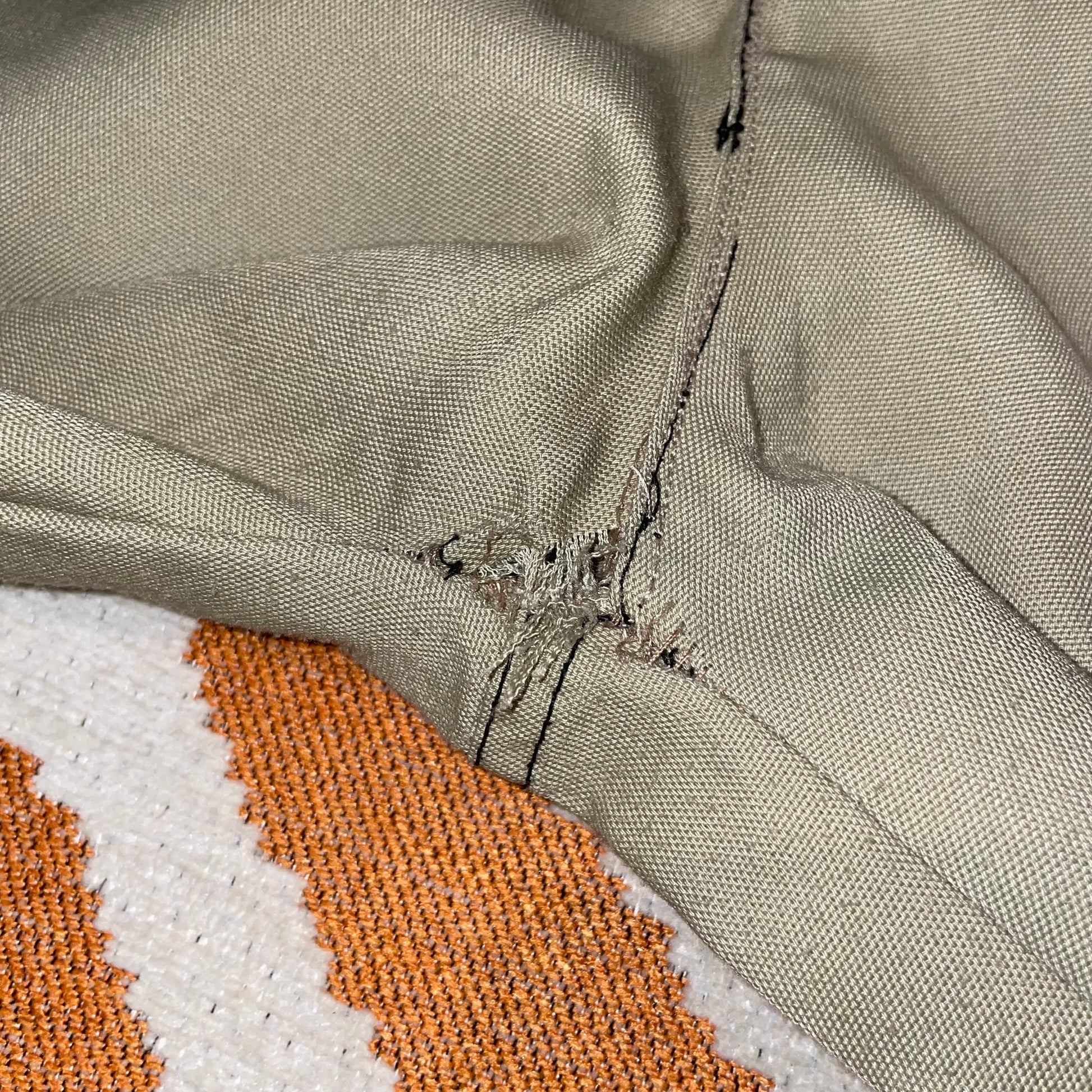 Worn cuffs, damage at crotch, marks on back of left leg.