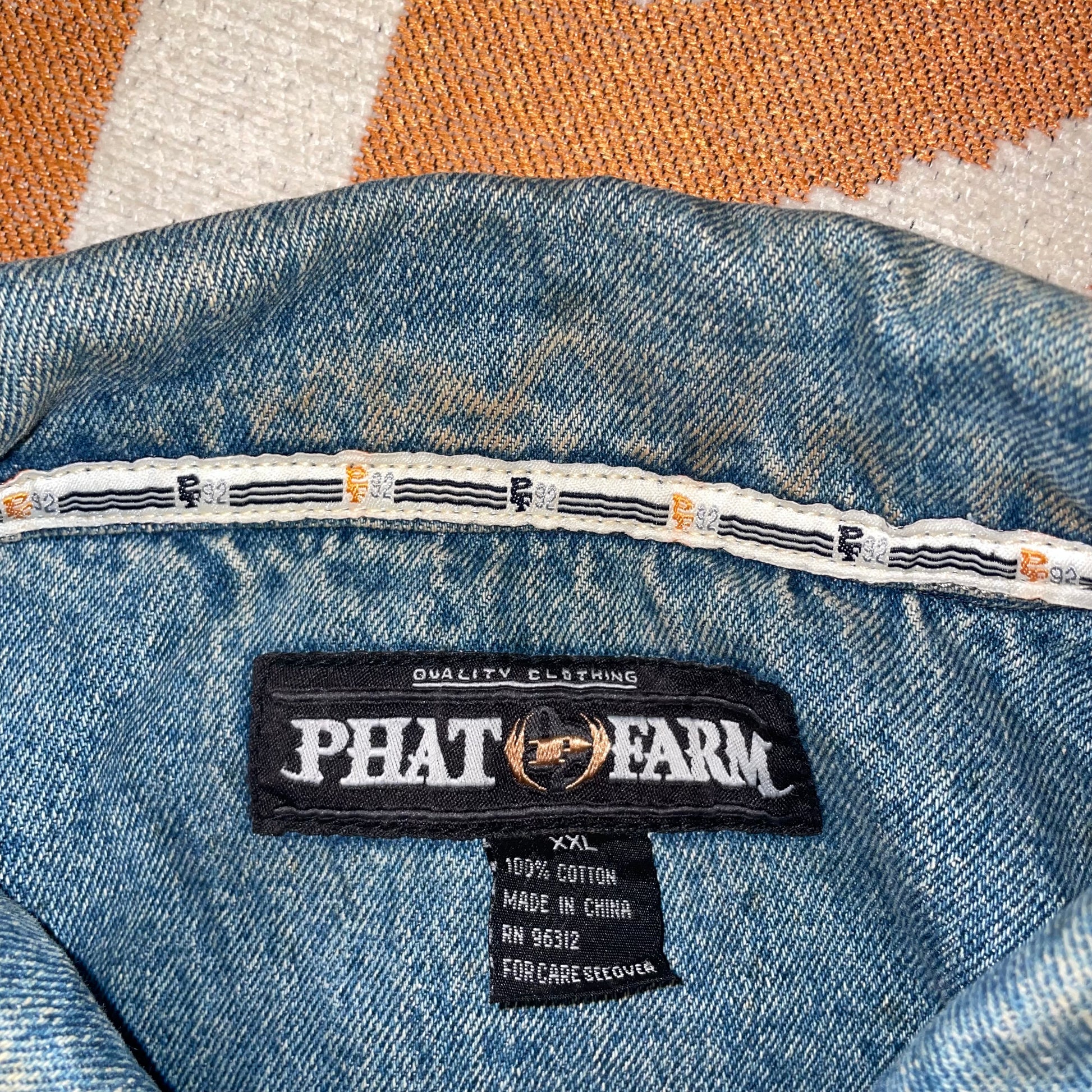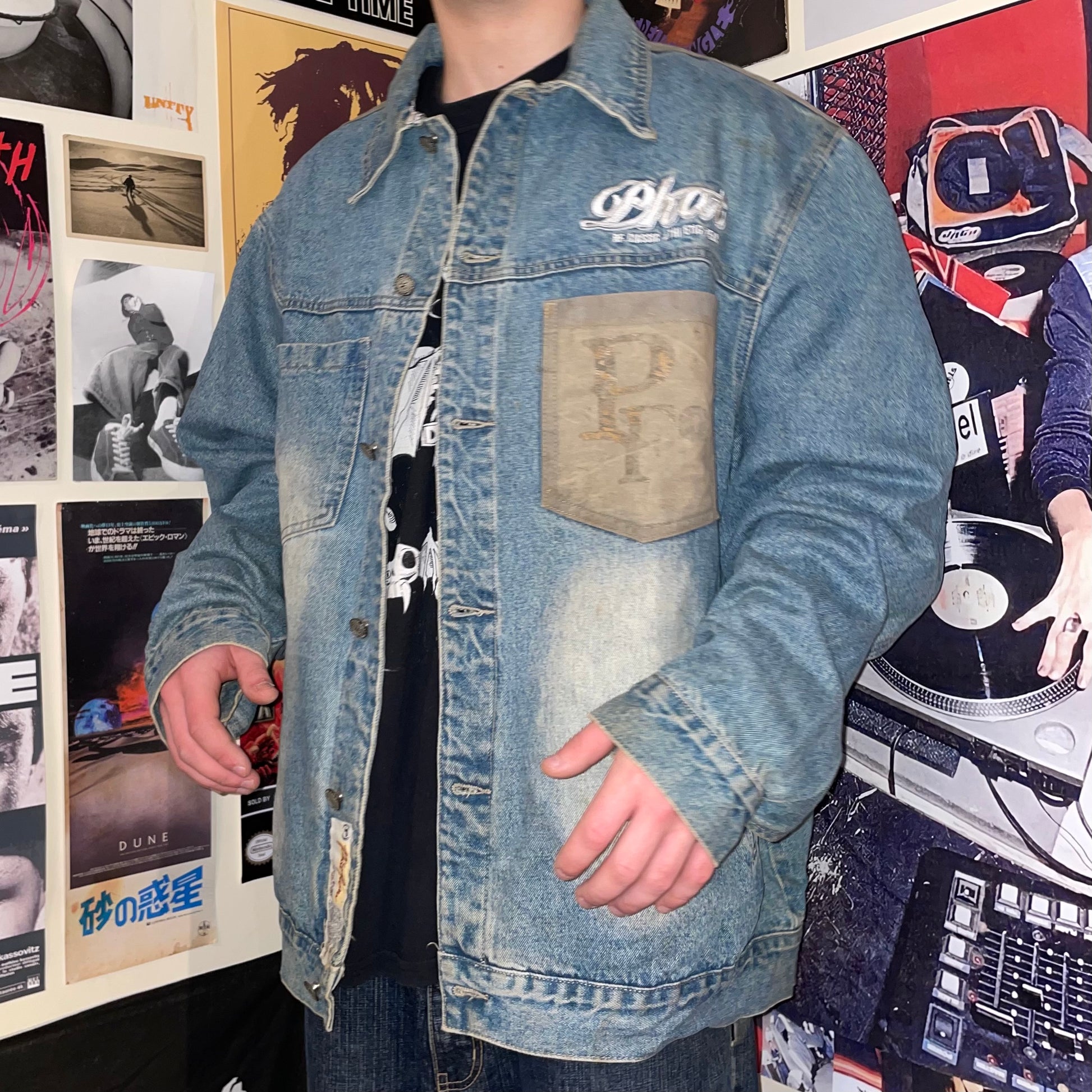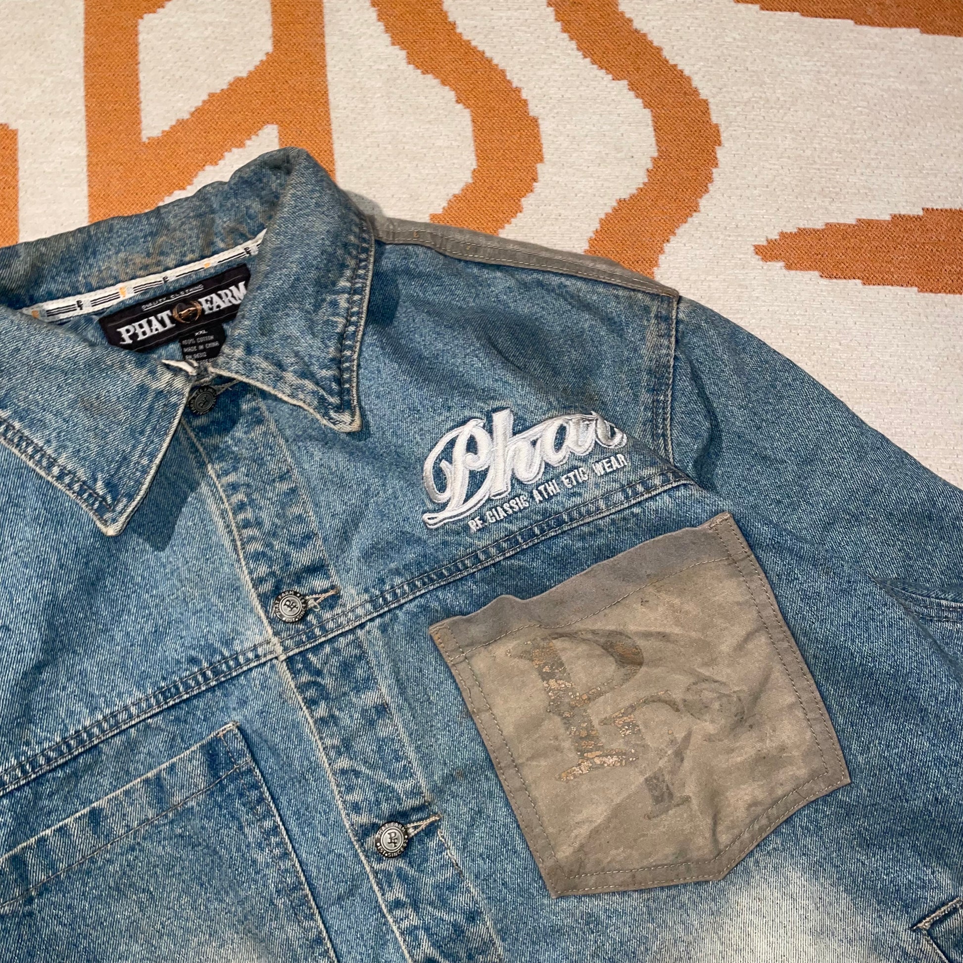 Beautiful 2000s Phat Farm denim jacket with panelled/embroidered design. Lettering on chest. Loose industrial fit.