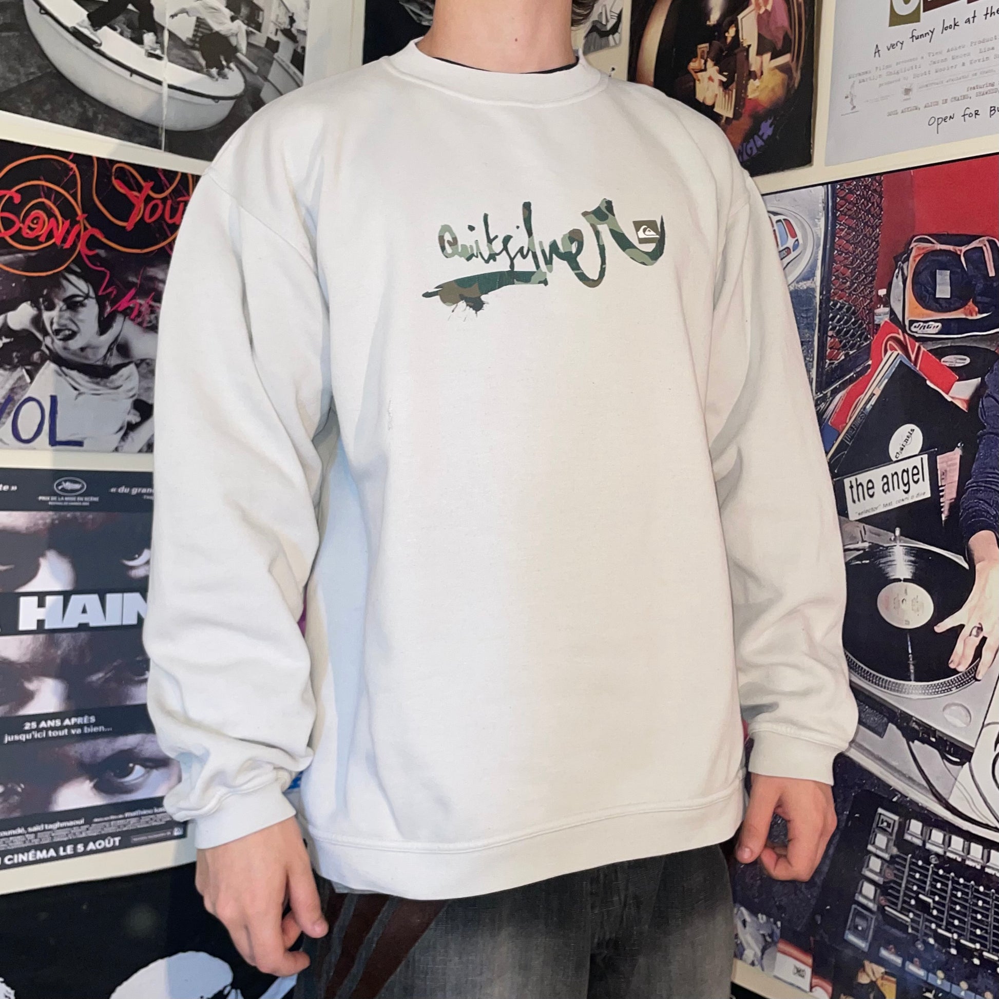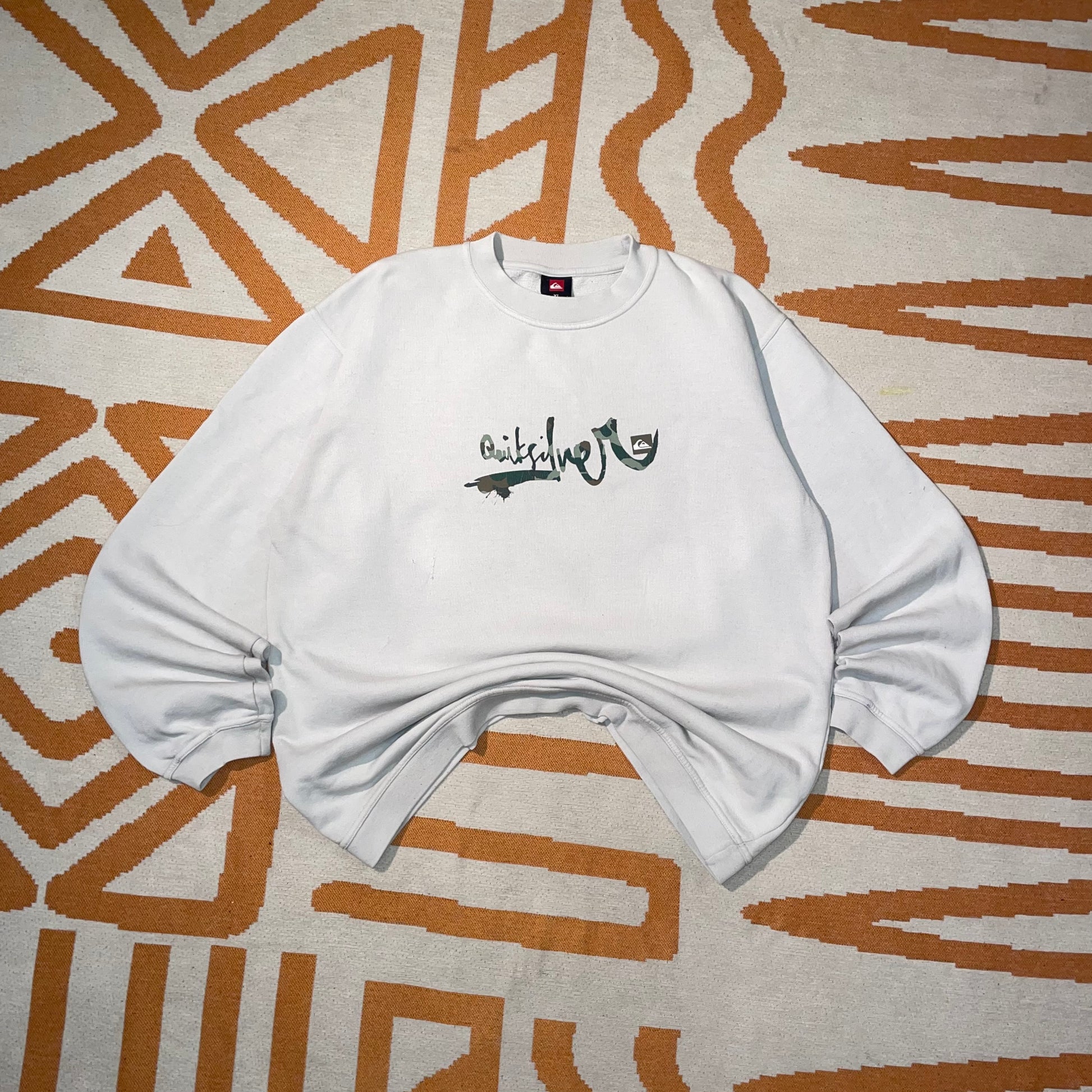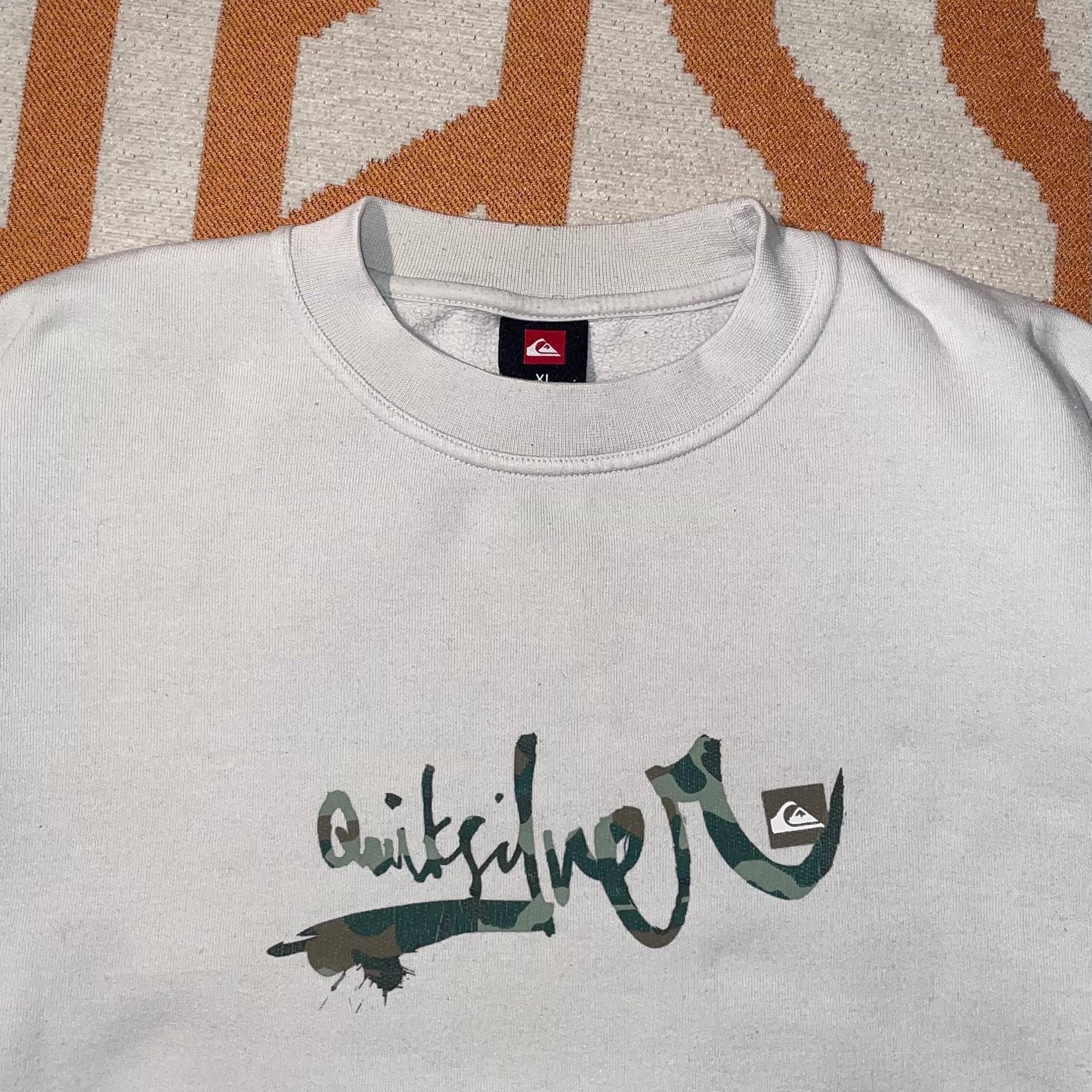 Cool 2000s Quiksilver jumper with printed 'camo signature' decal on front and loose comfy fit. Iconic y2k surfwear brand.