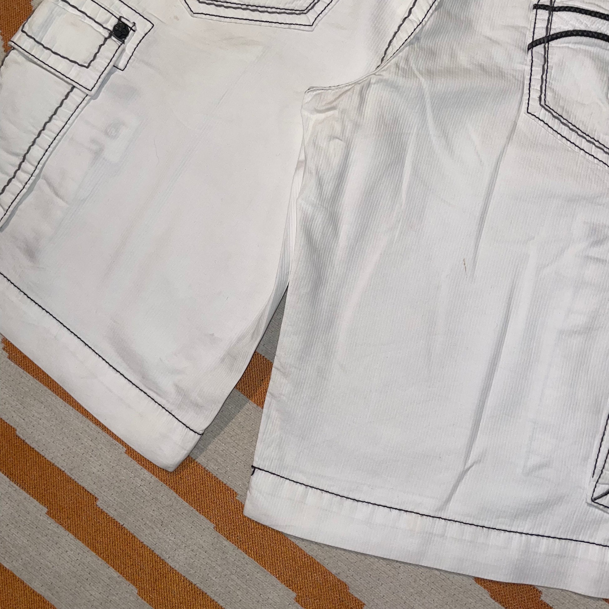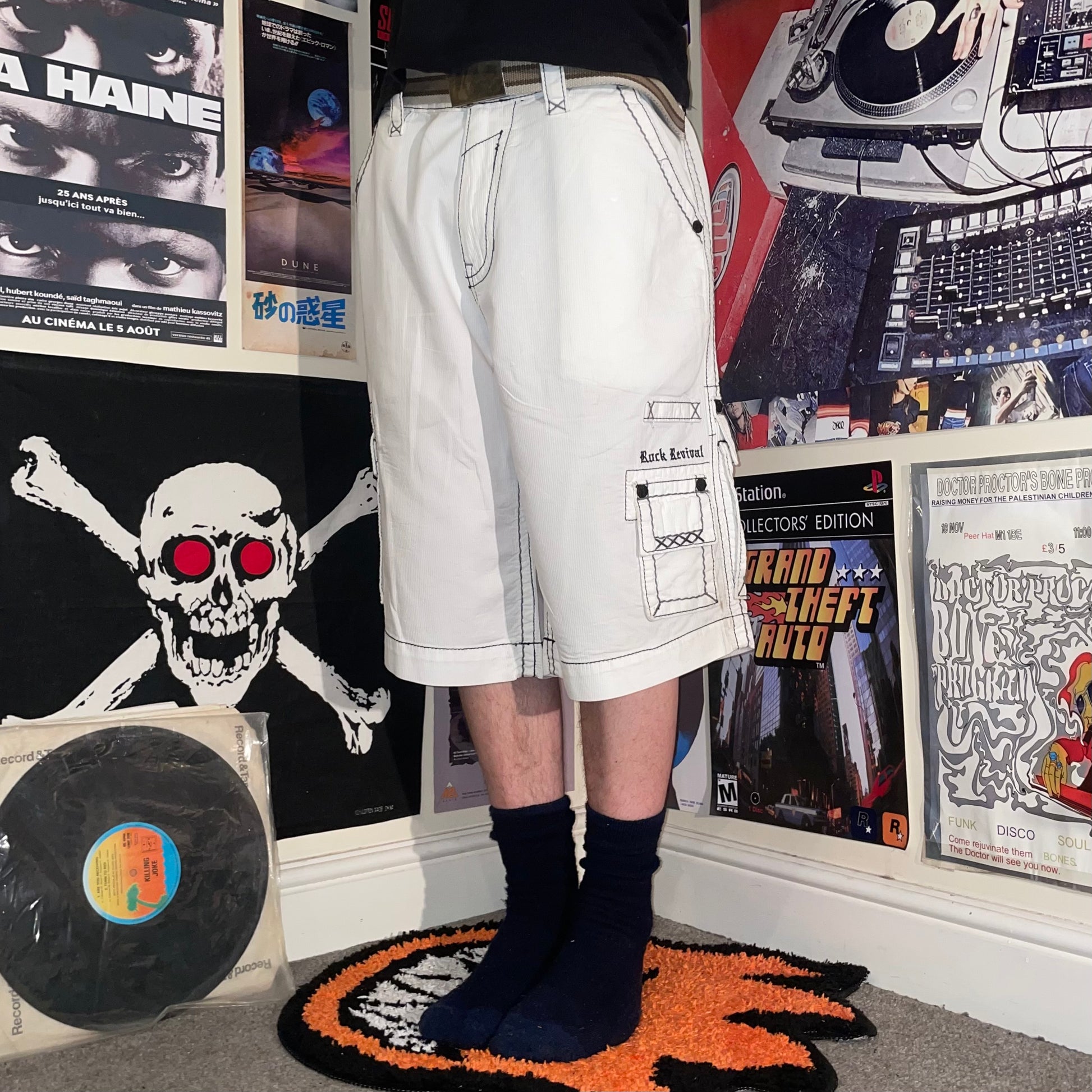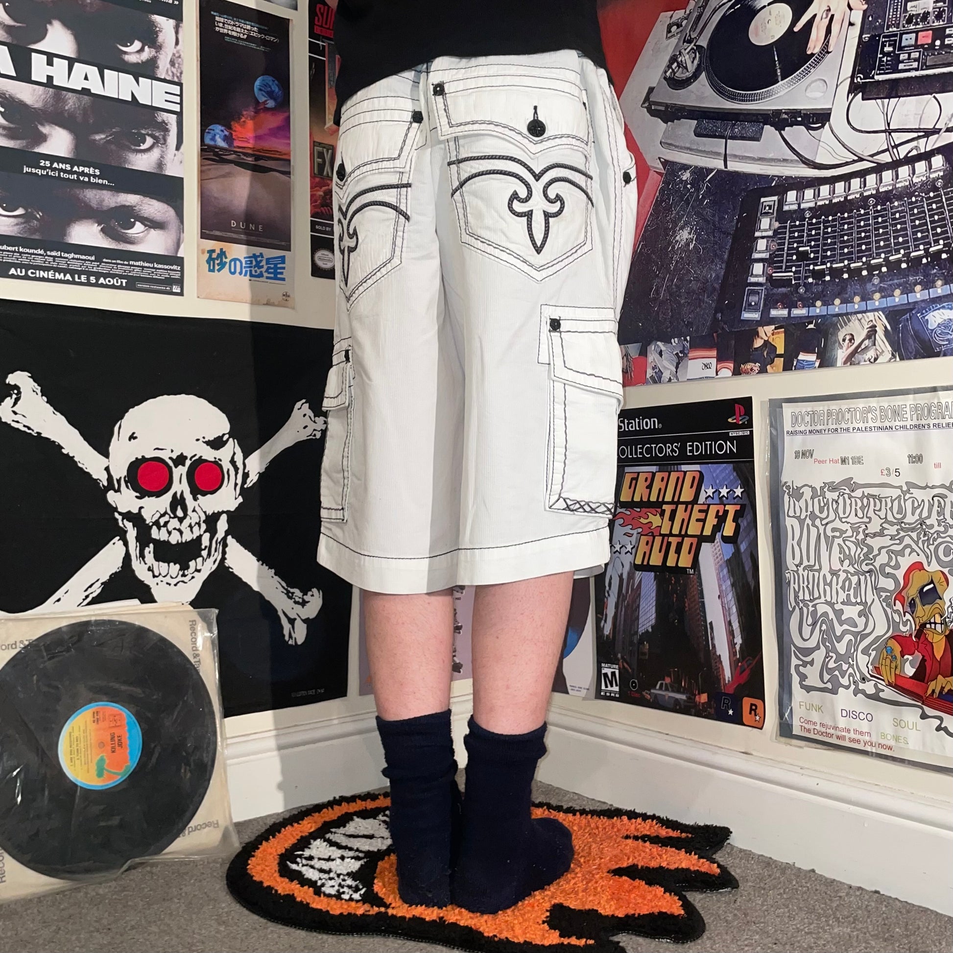 Cool 2000s Rock Revival cargo shorts with embroidered black contrast stitch details over pockets and lettering on leg. Baggy y2k-style fit.