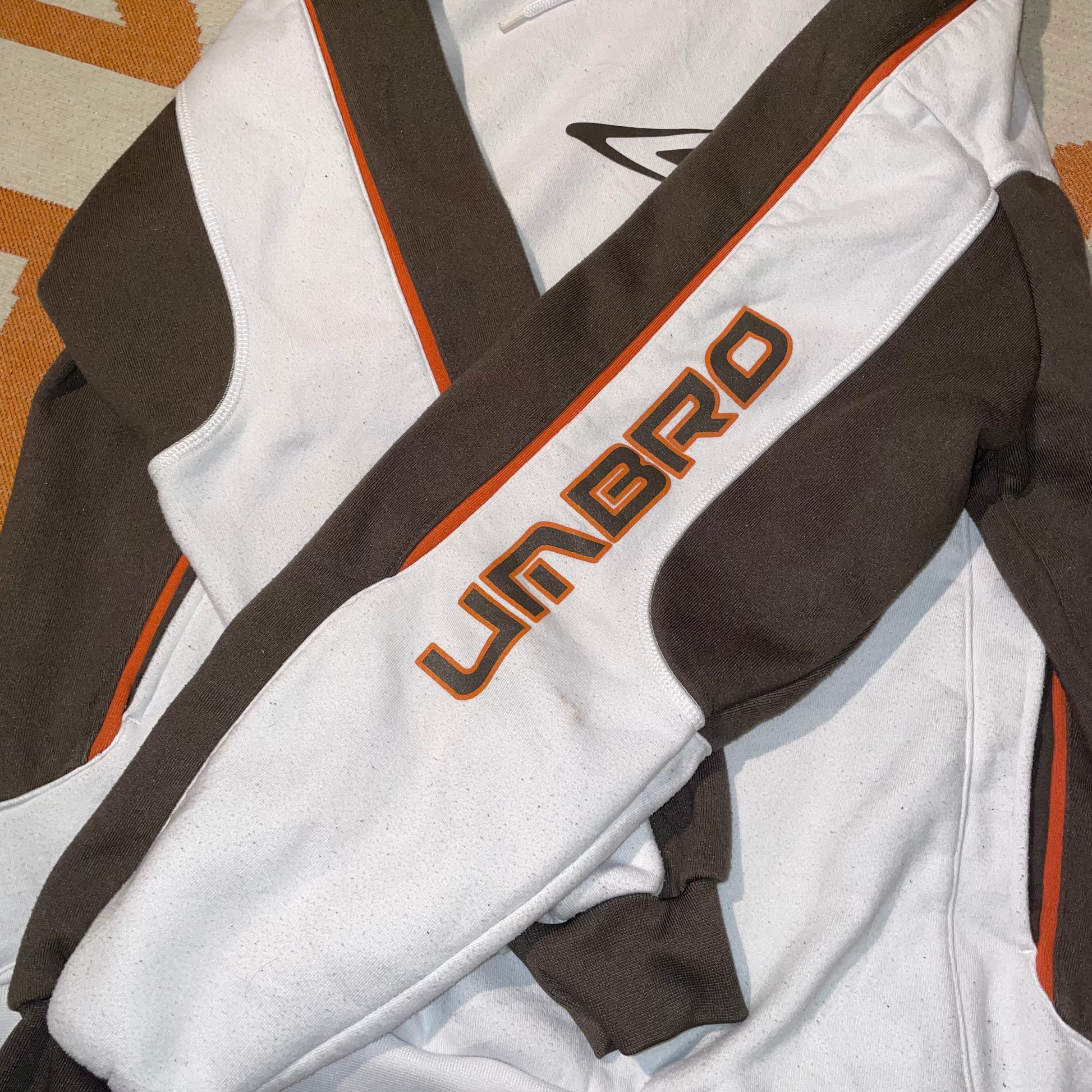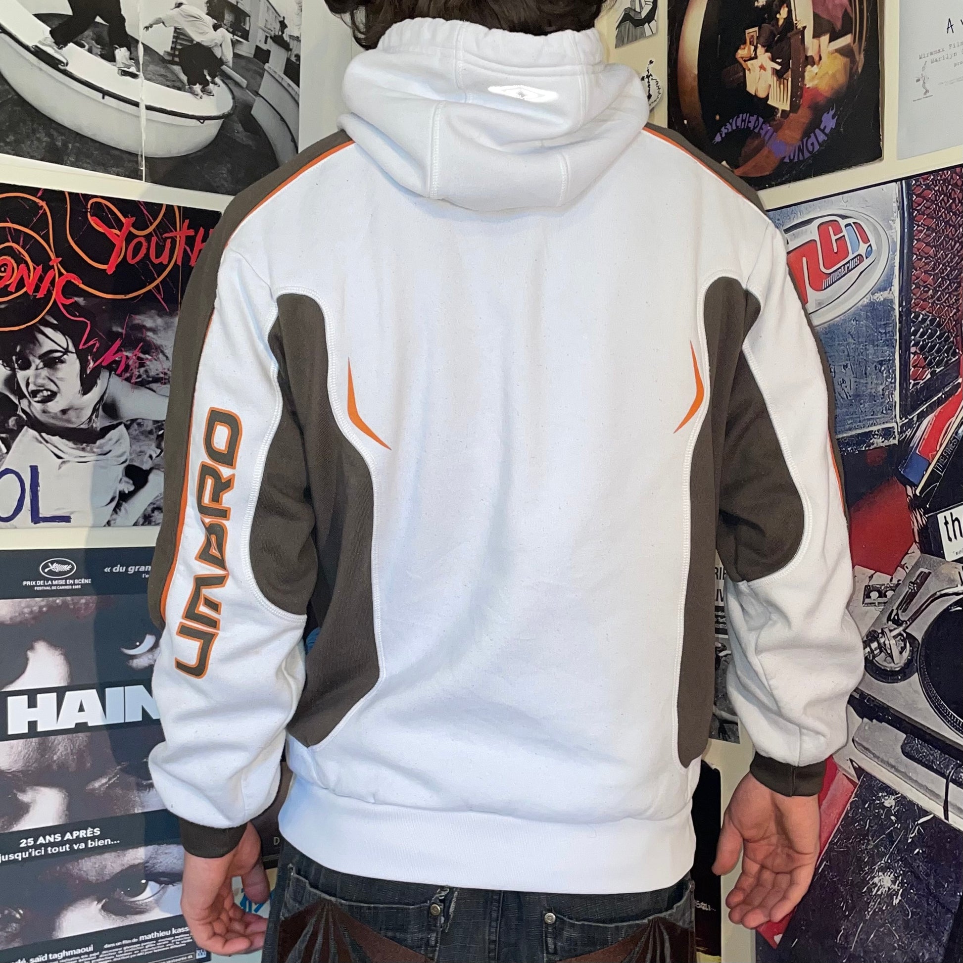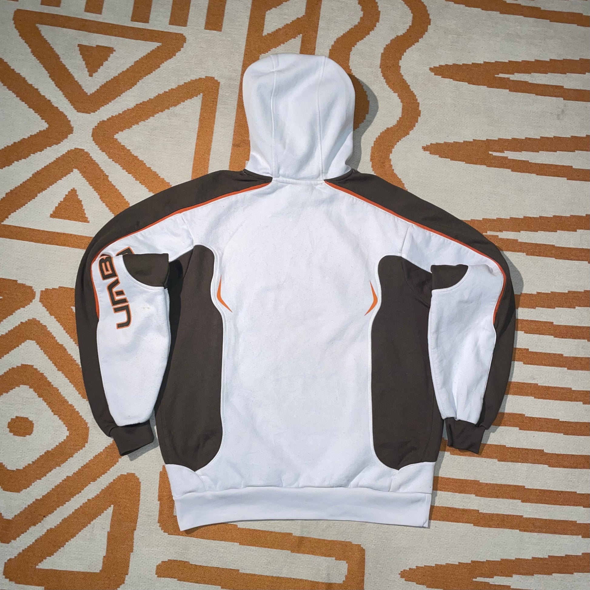 Cool 2000s Umbro sports hoodie with brown/white panelling and printed orange decals on chest/sleeve. Reflective print on hood. Really sick design and relaxed fit.