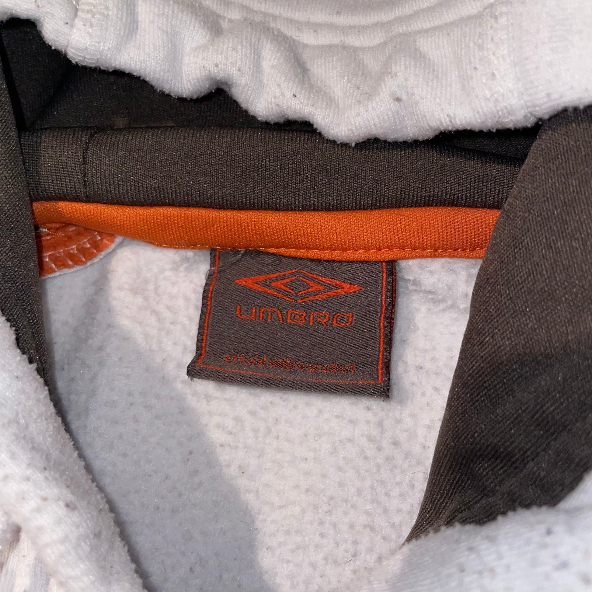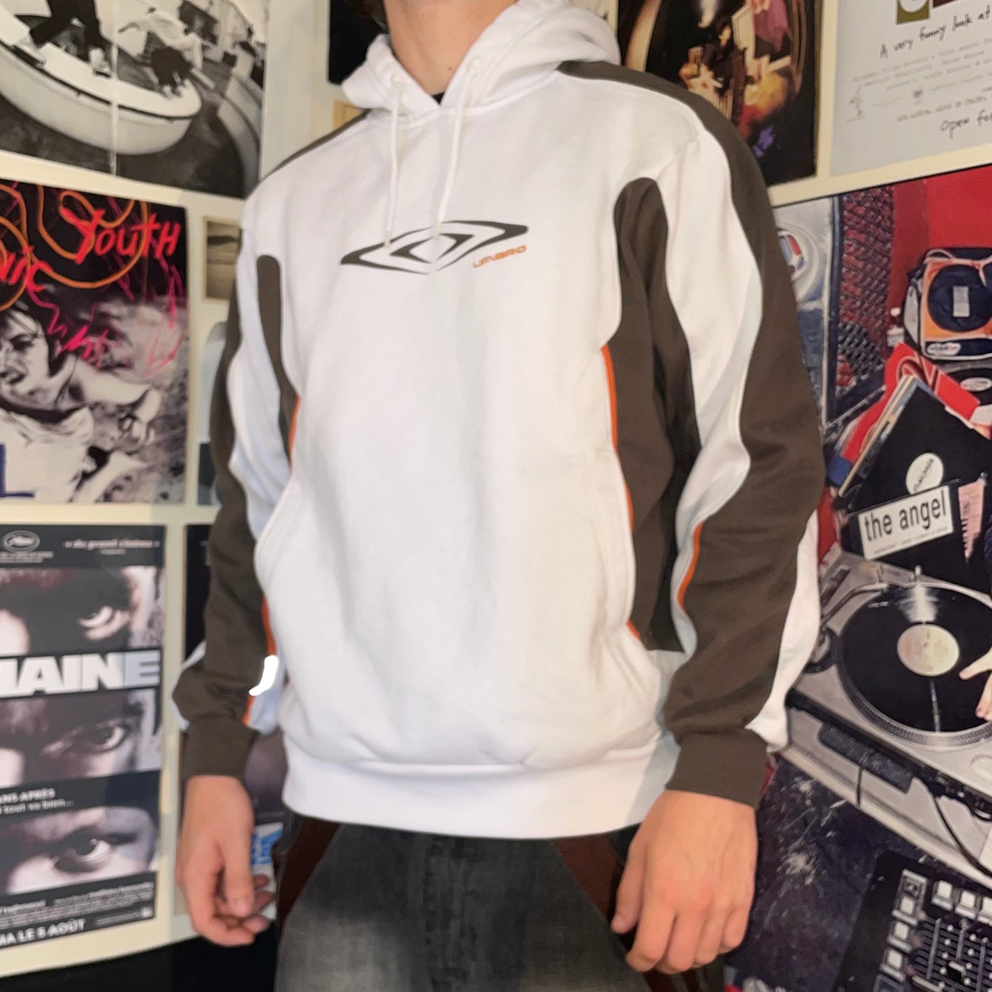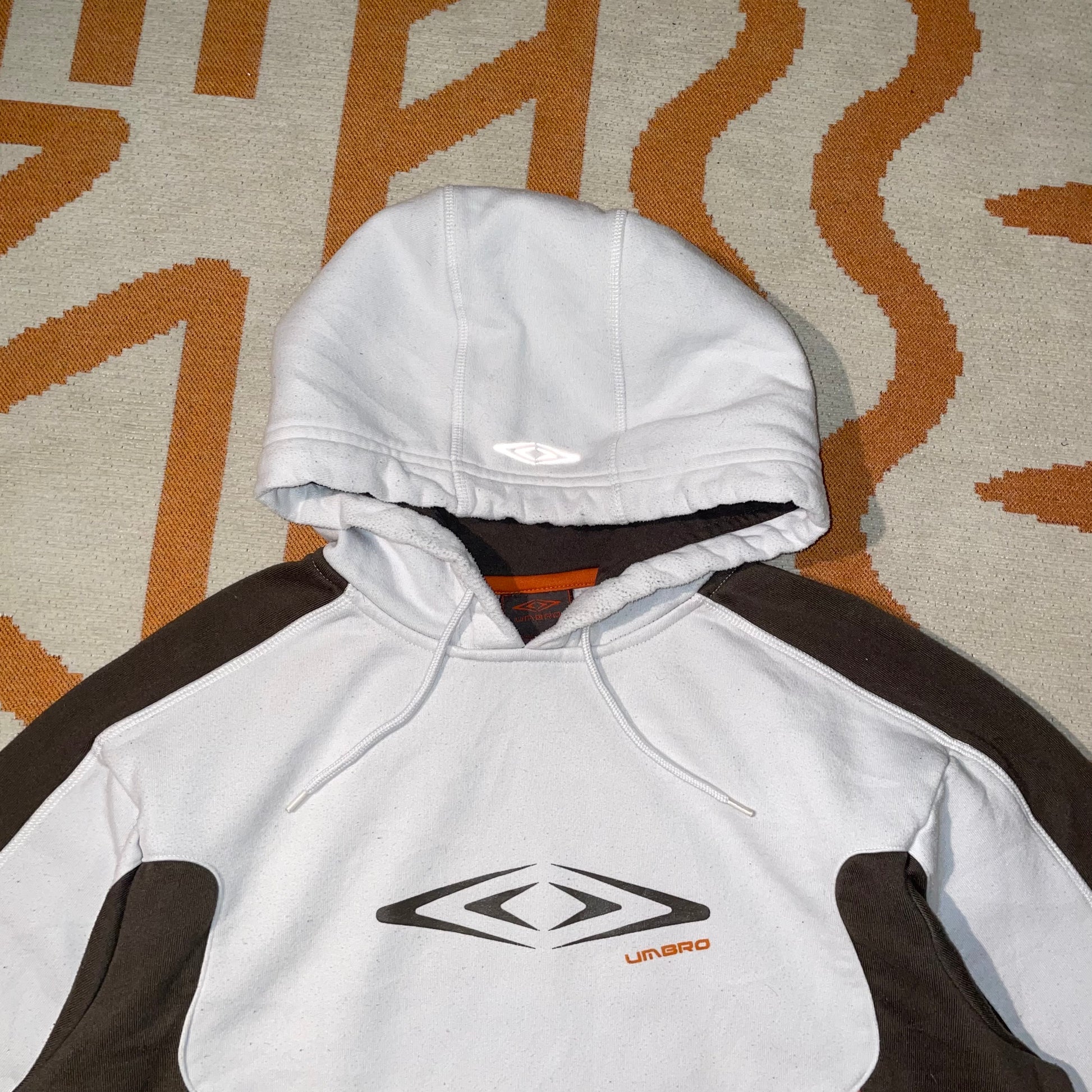 Cool 2000s Umbro sports hoodie with brown/white panelling and printed orange decals on chest/sleeve. Reflective print on hood. Really sick design and relaxed fit.
